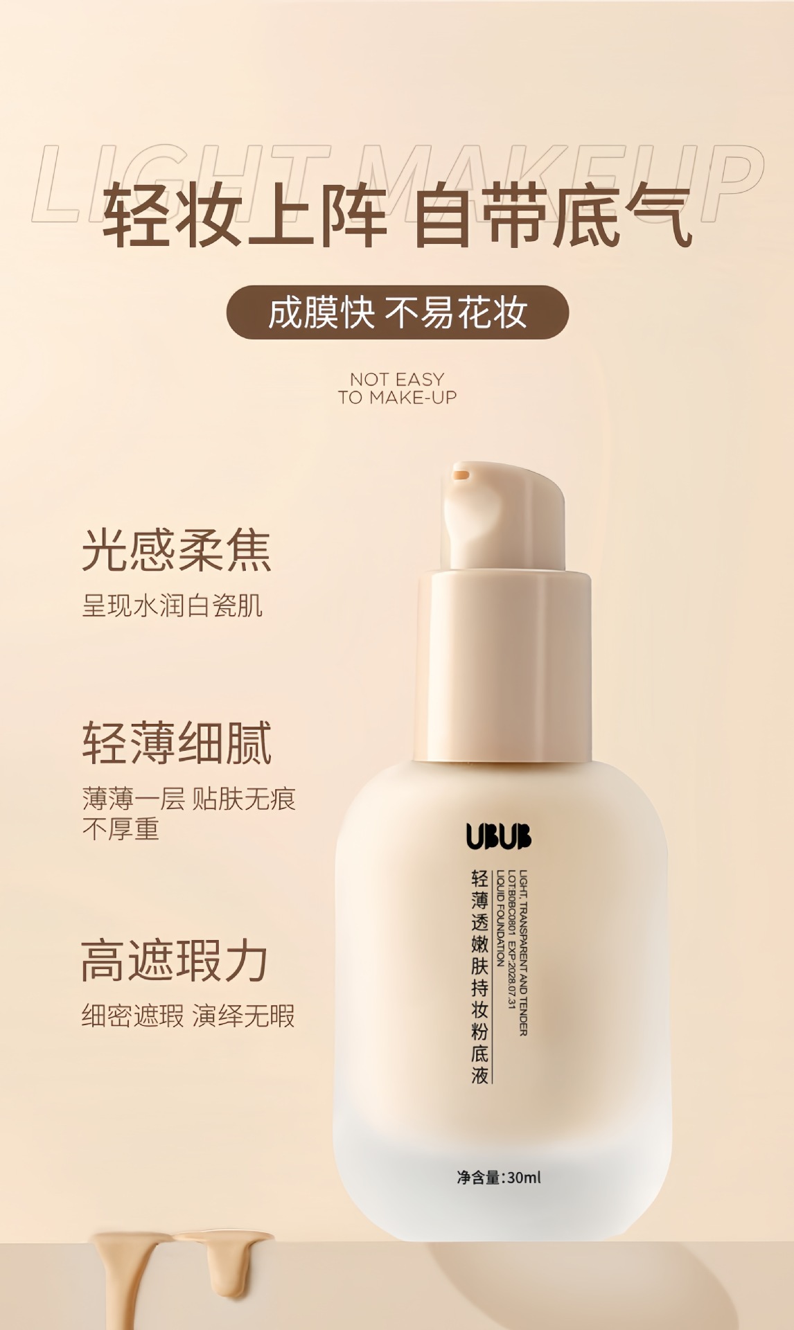 Ubub紅参ツバメの巣の多ペプチドの柔らかい肌のファンデーションの液体の持続的な保湿のカバーの防水は汗を防ぎます。