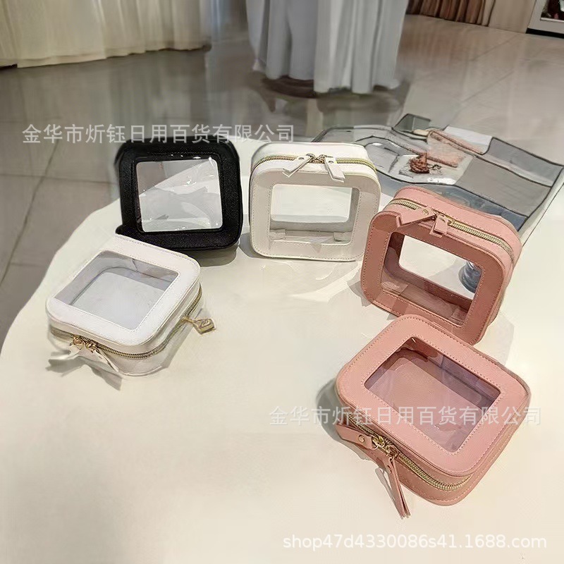 透明PVC洗面バッグ旅行洗面バッグ四角いジッパー収納バッグpu皮ステッチ防水化粧バッグ現物
