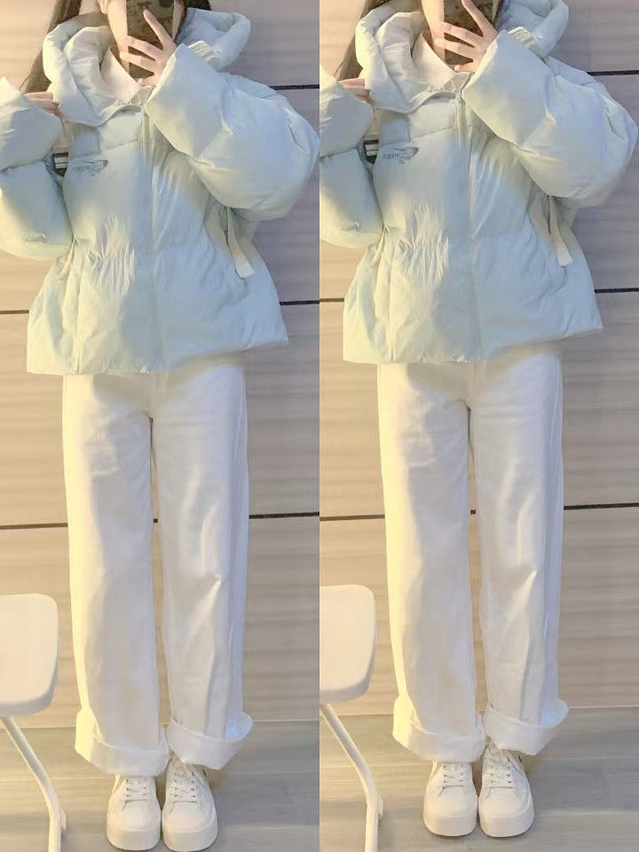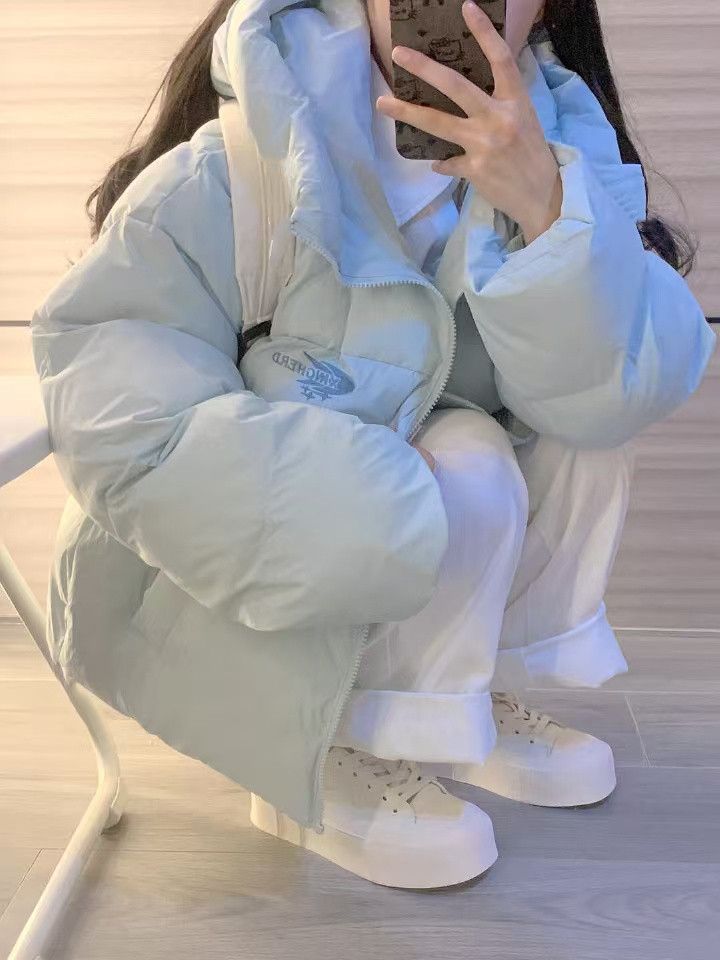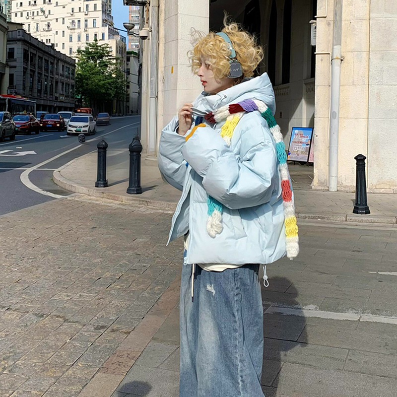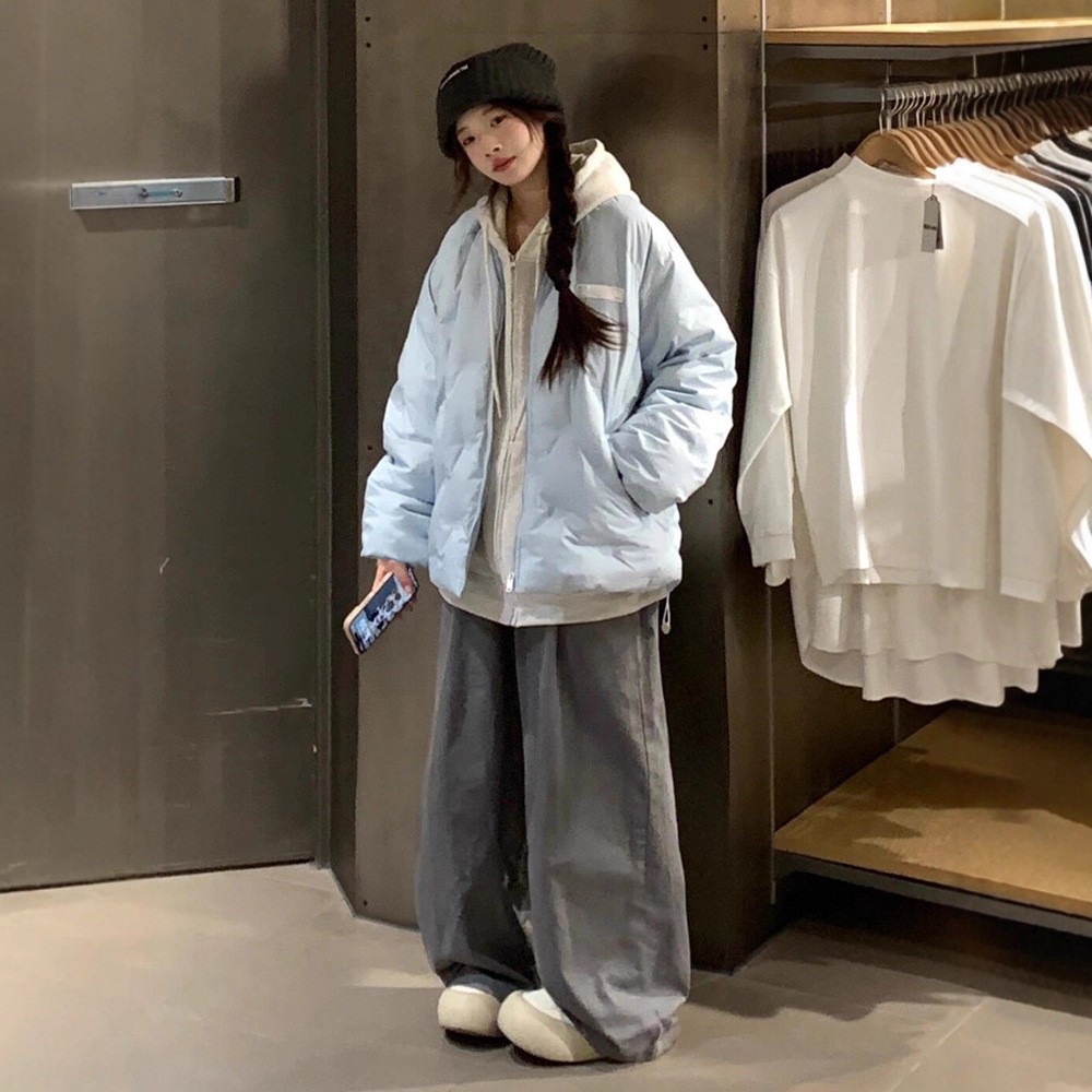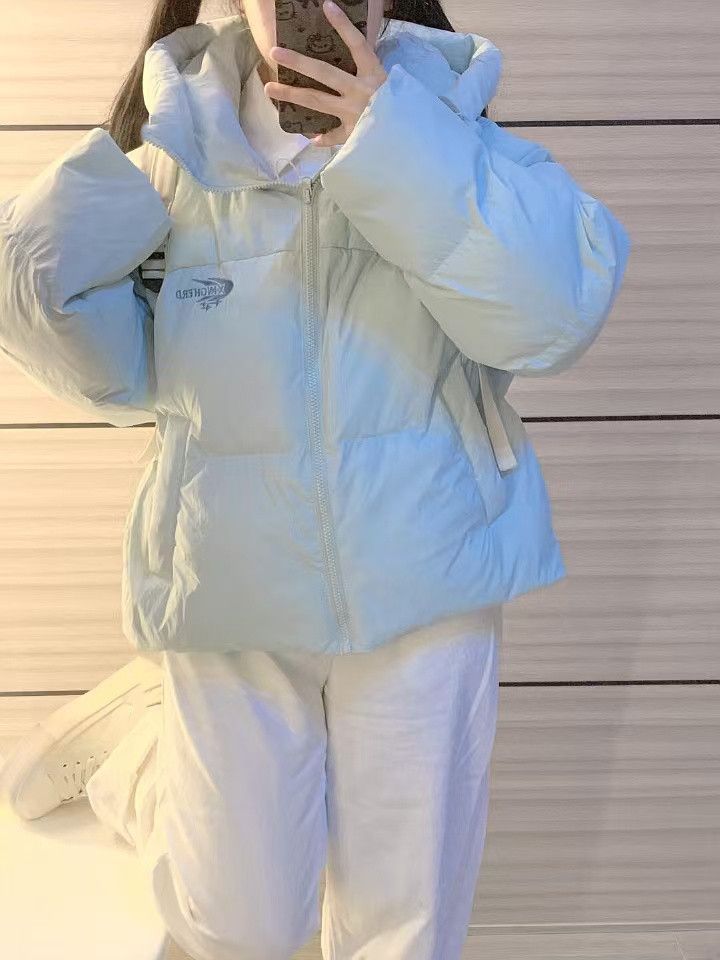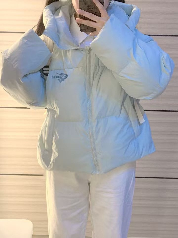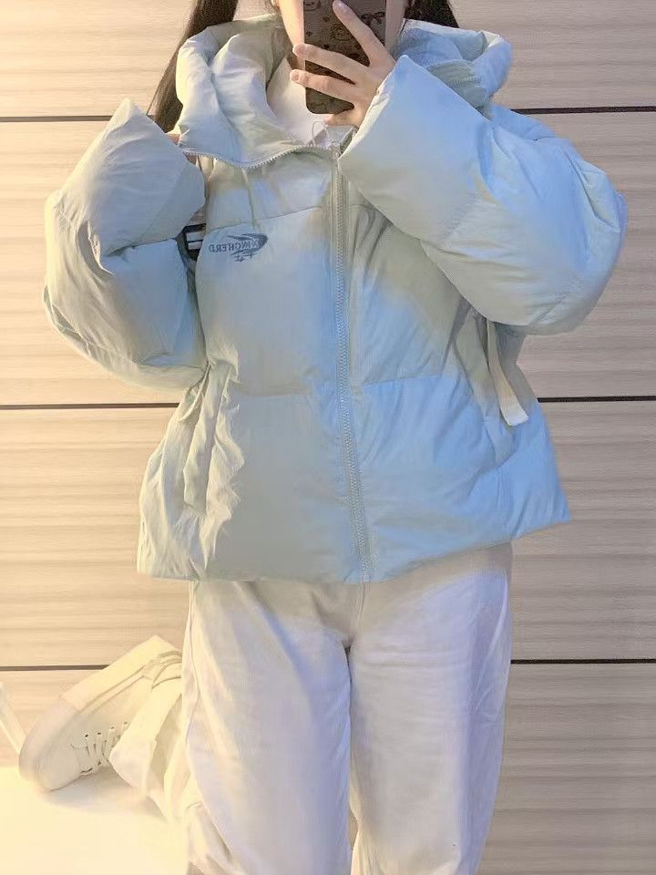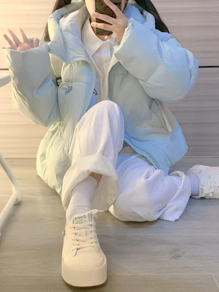 慵懒风天蓝色连帽加厚保暖面包服冬季小个子百搭字母刺绣棉服外套