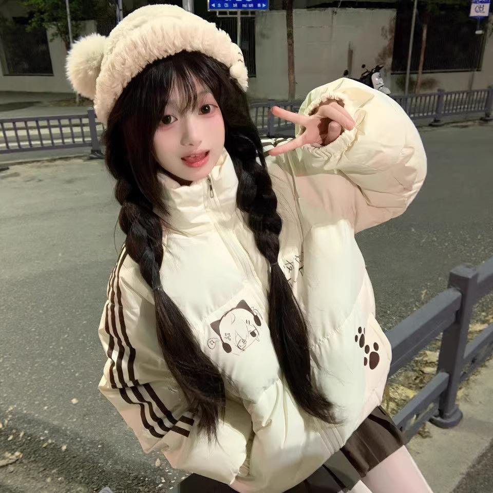日系软萌风撞色连帽棉服外套女冬季新款宽松保暖魔术贴小猫面包服