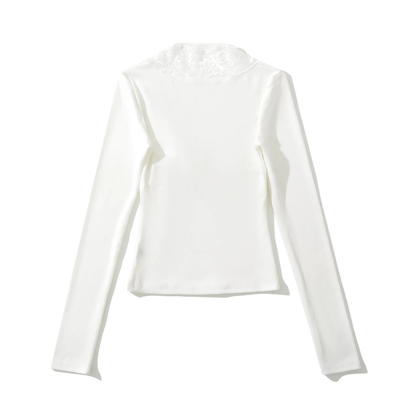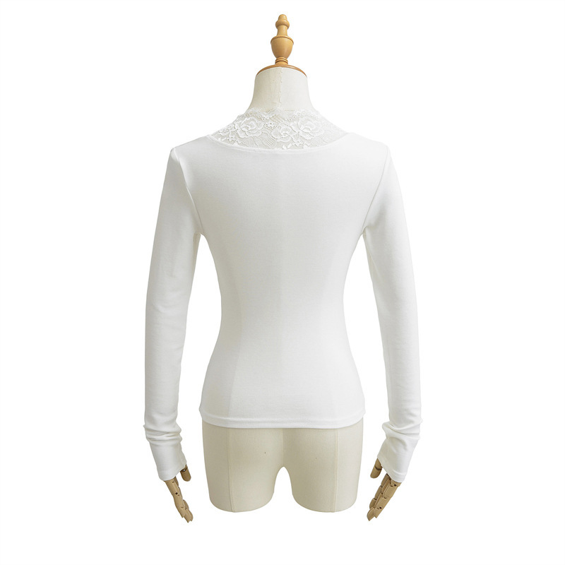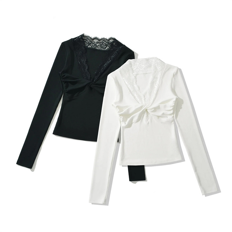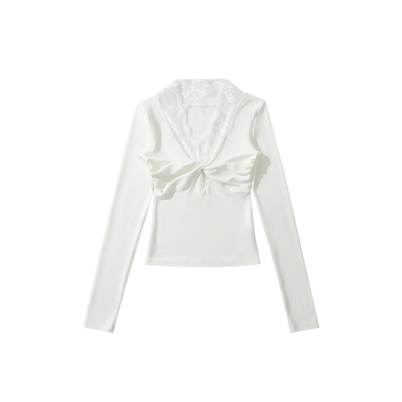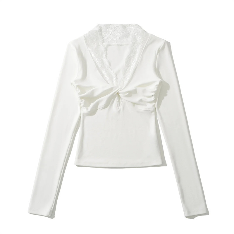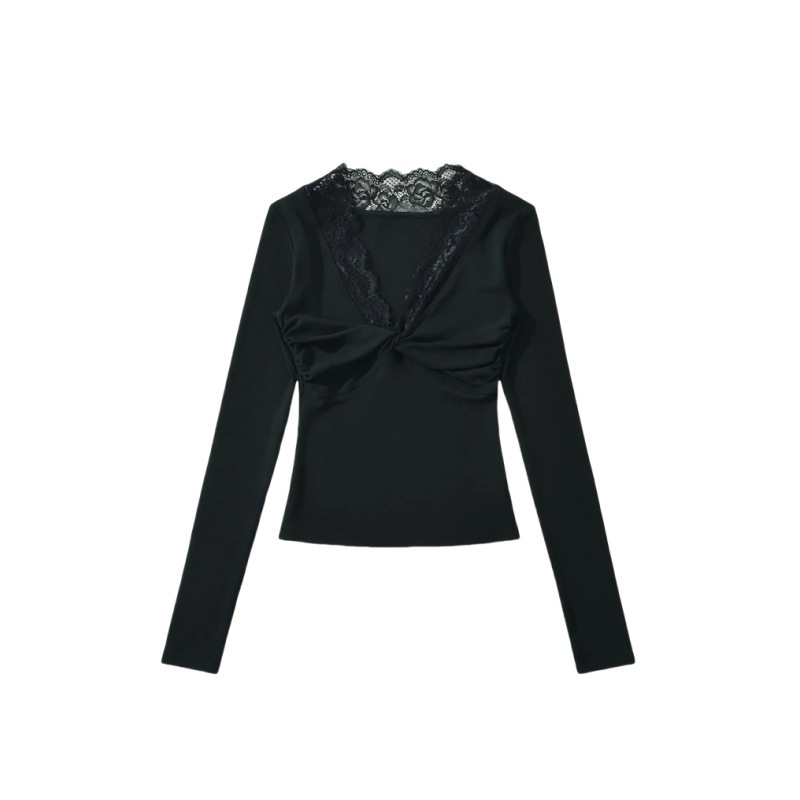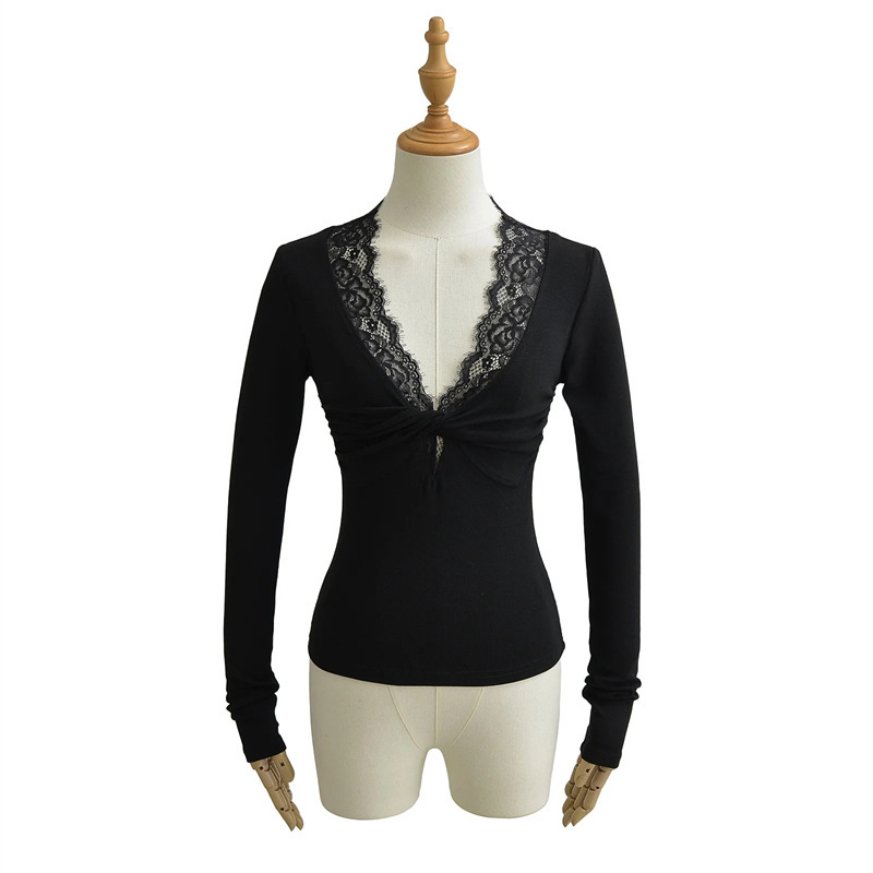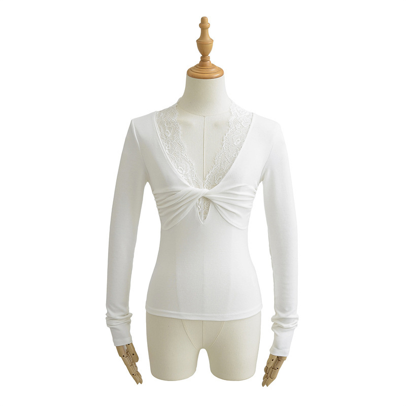 1526-24秋の新型アメリカ式純欲風レースのねじりvネック長袖修身底付き上着tシャツ