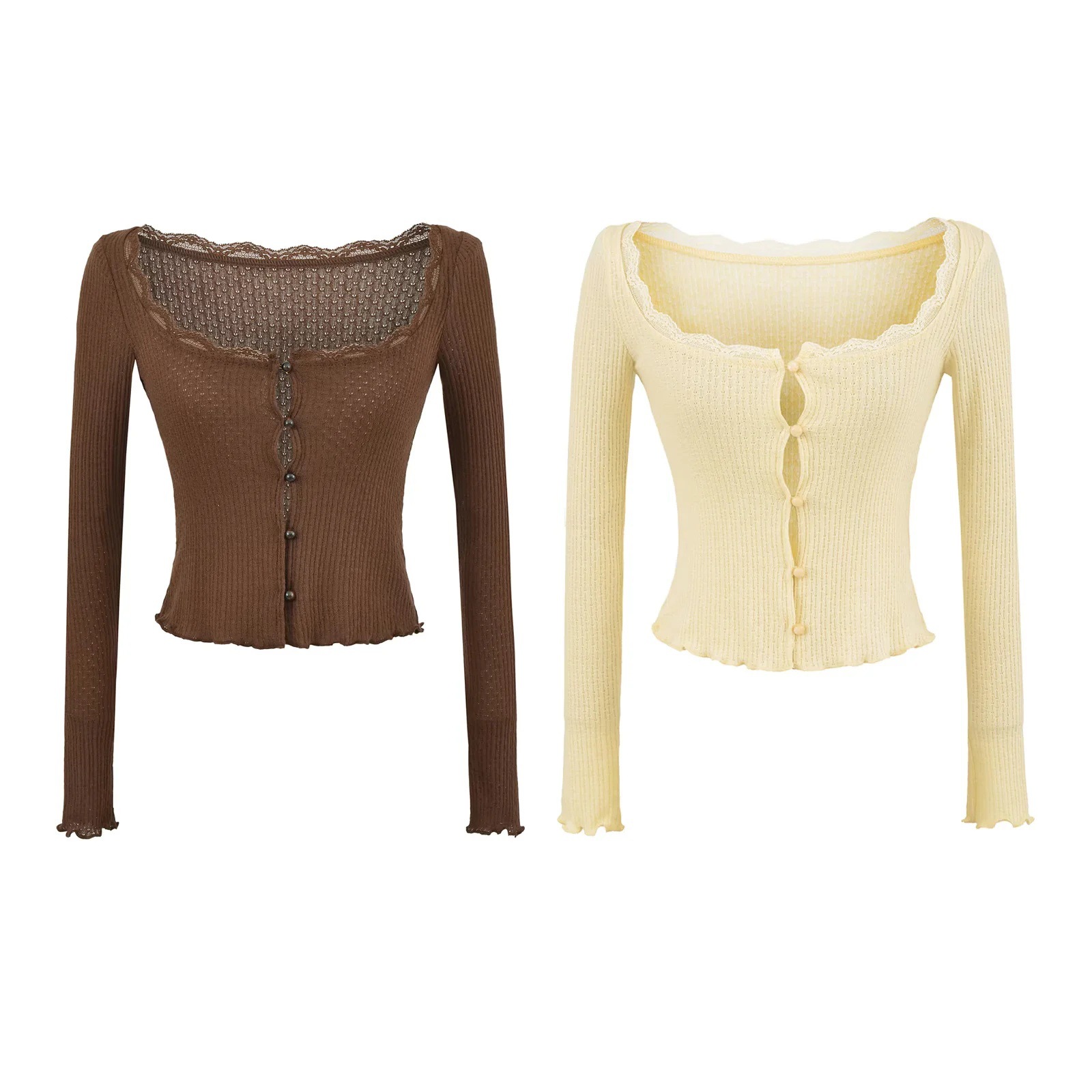 美式复古提花毛织密拷花边低胸上衣单排扣修身显瘦短款针织打底衫