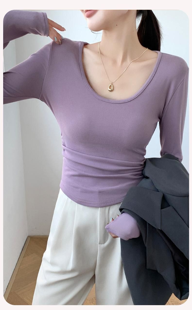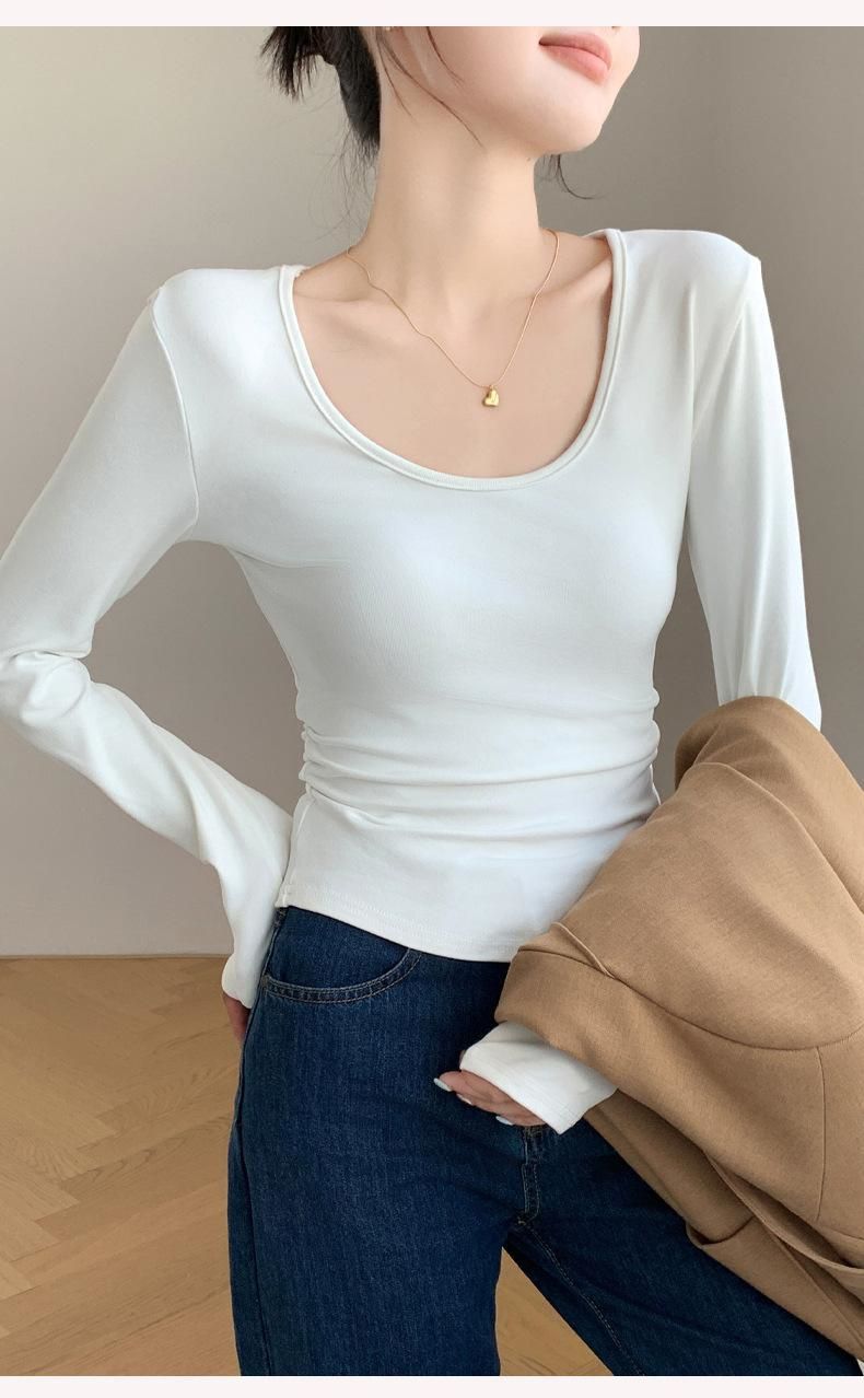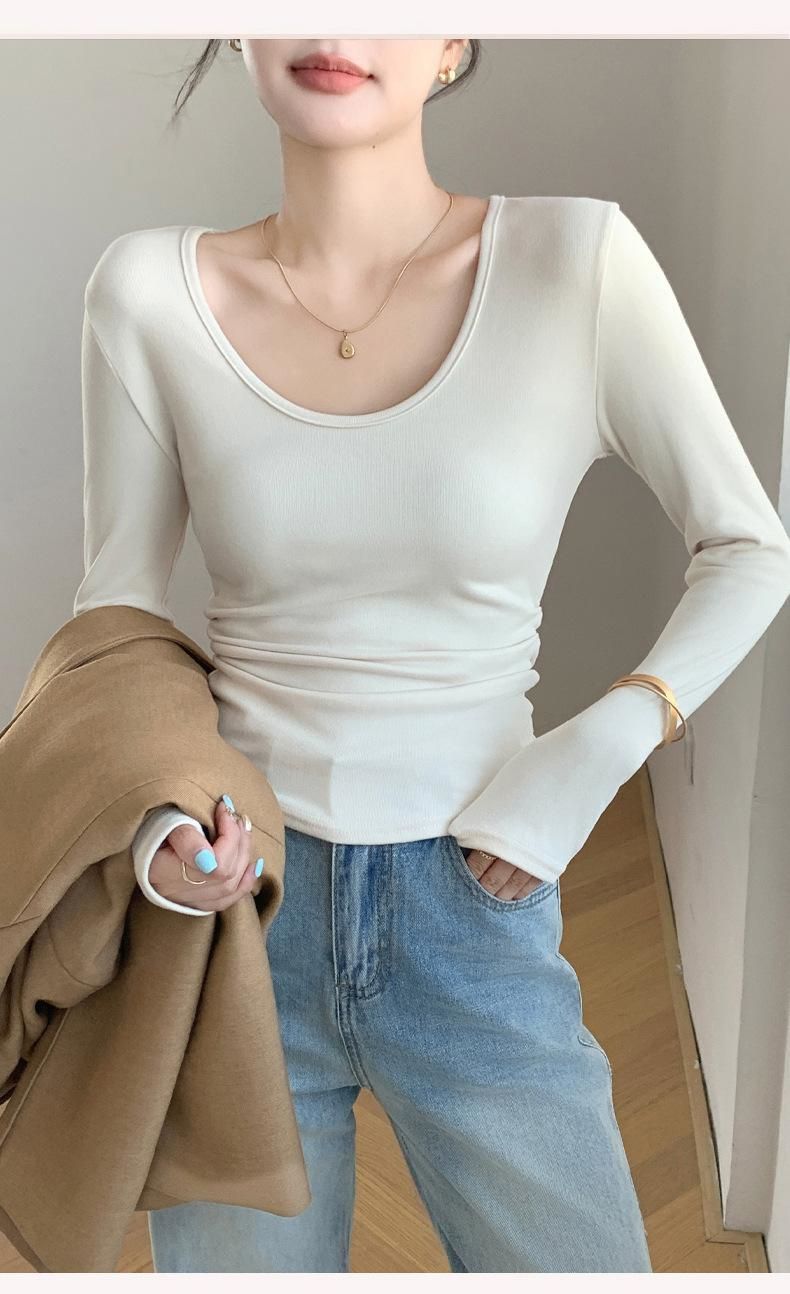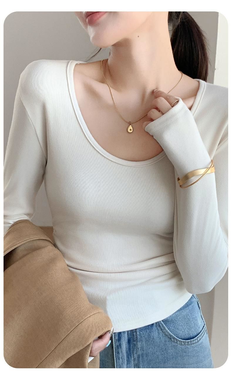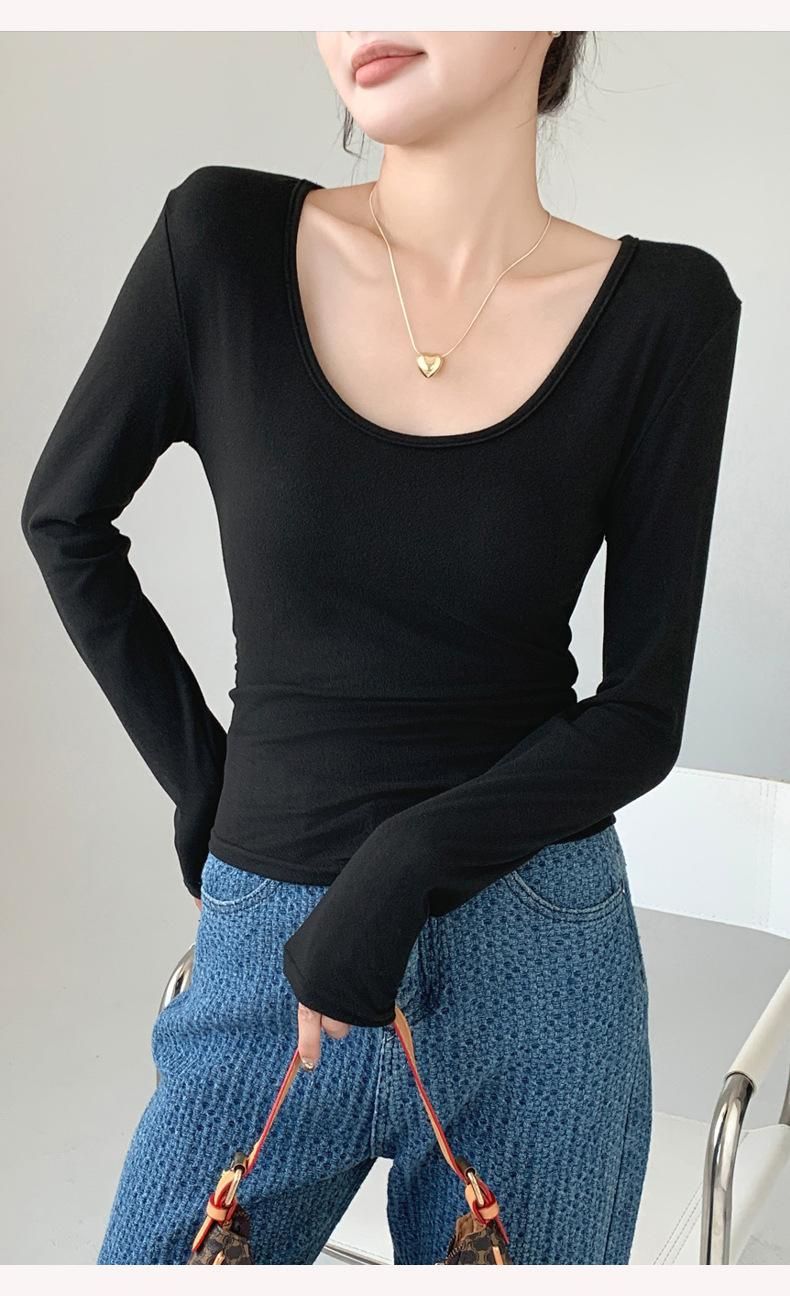 秋冬磨毛带胸垫长袖大U领T恤内搭百搭保暖衣女显胸修身加绒打底衫