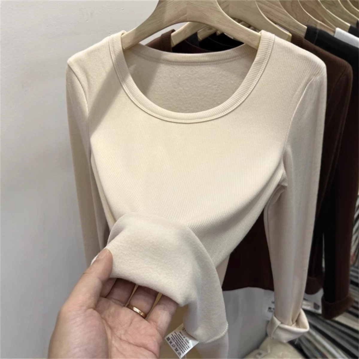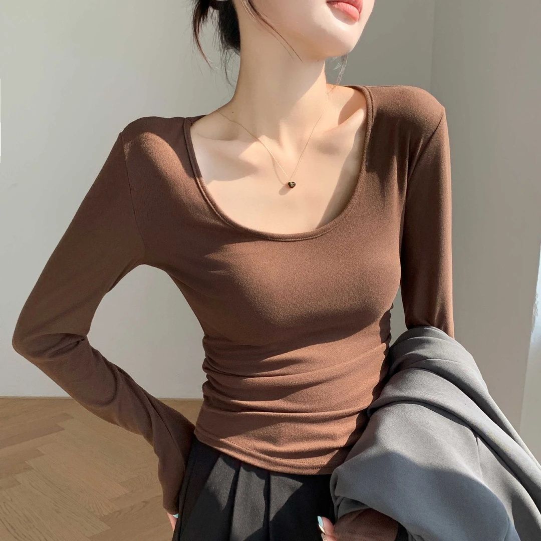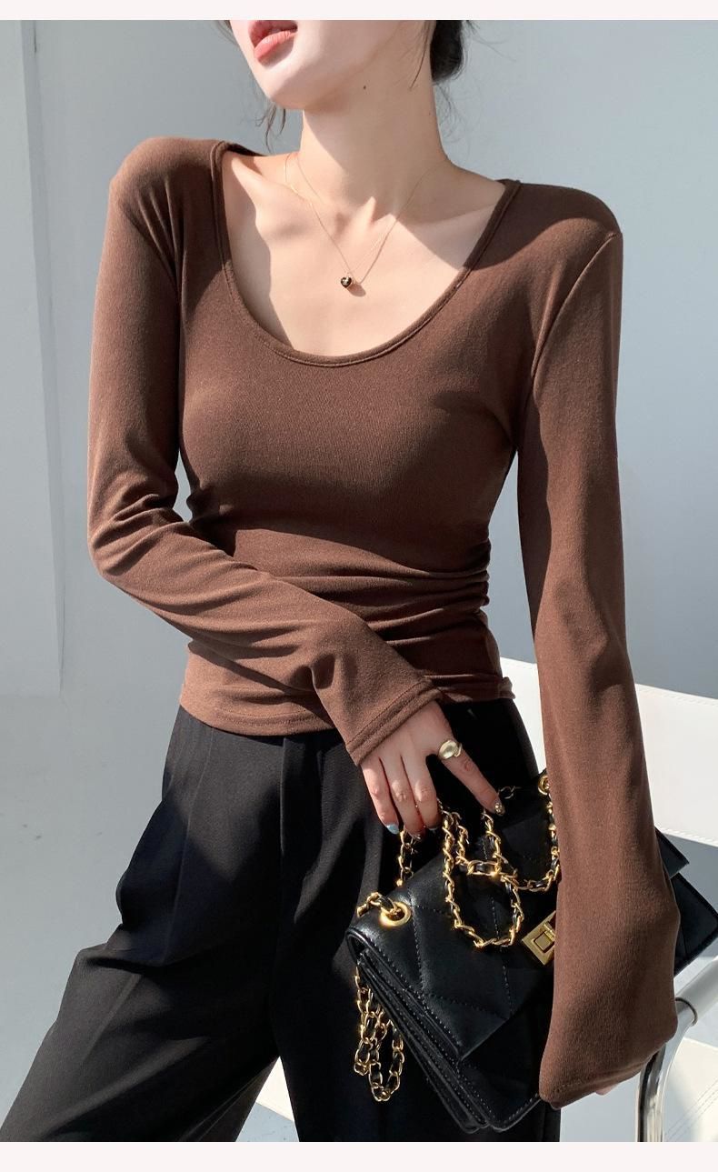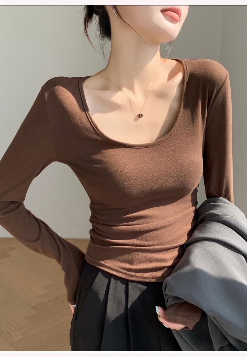 秋冬磨毛带胸垫长袖大U领T恤内搭百搭保暖衣女显胸修身加绒打底衫