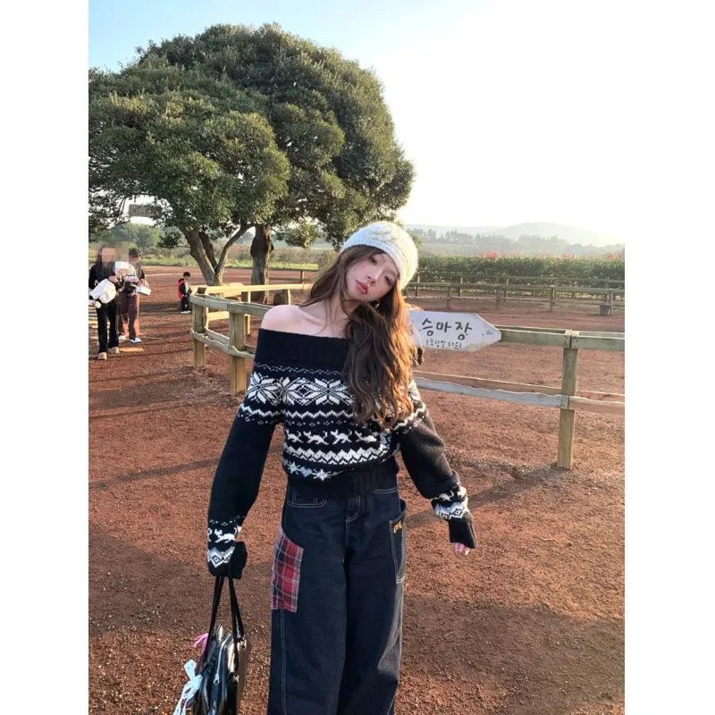 フェア島ジャカード一字肩セーター女性秋冬新作雰囲気感ニット