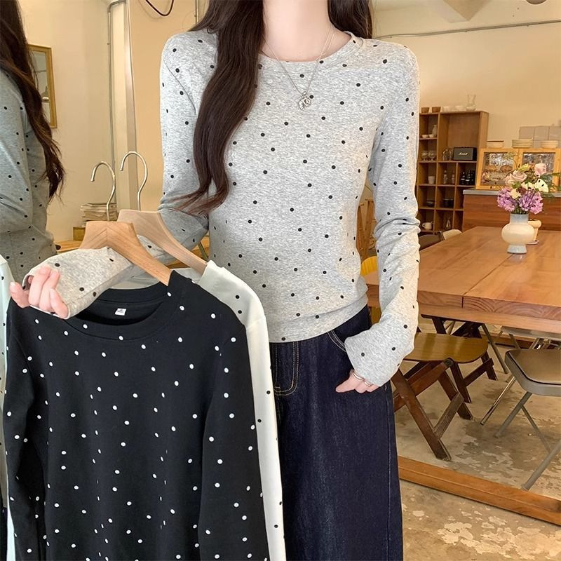 デザイン感のある丸首の波点丸首の背中に長袖のtシャツを透かしています。