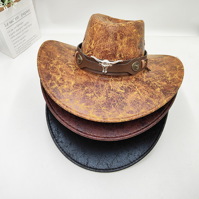 跨境新款西部牛仔帽裂纹牛头复古男女新款户外出游平顶牛仔骑士帽