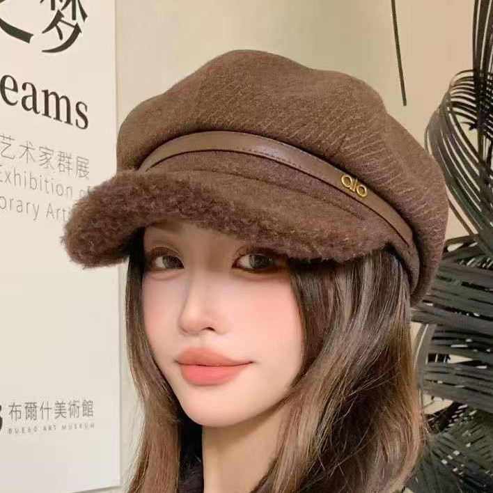 韩版秋冬季羊羔毛绒八角帽加厚保暖贝雷帽子女日系百搭鸭舌帽