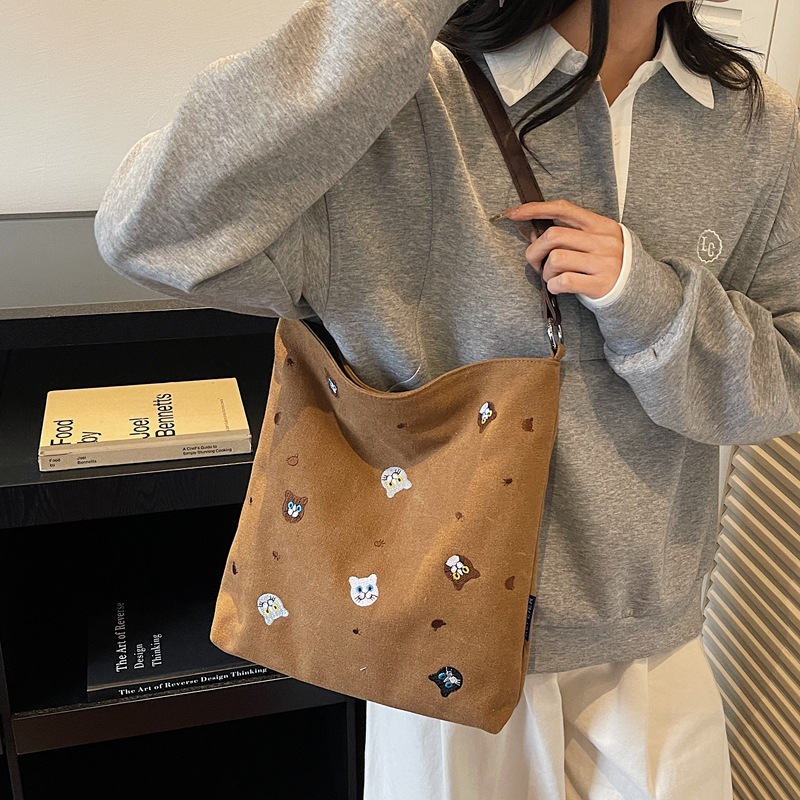大容量帆布包包2025新款手提包刺绣通勤斜跨包学生上课单肩托特包