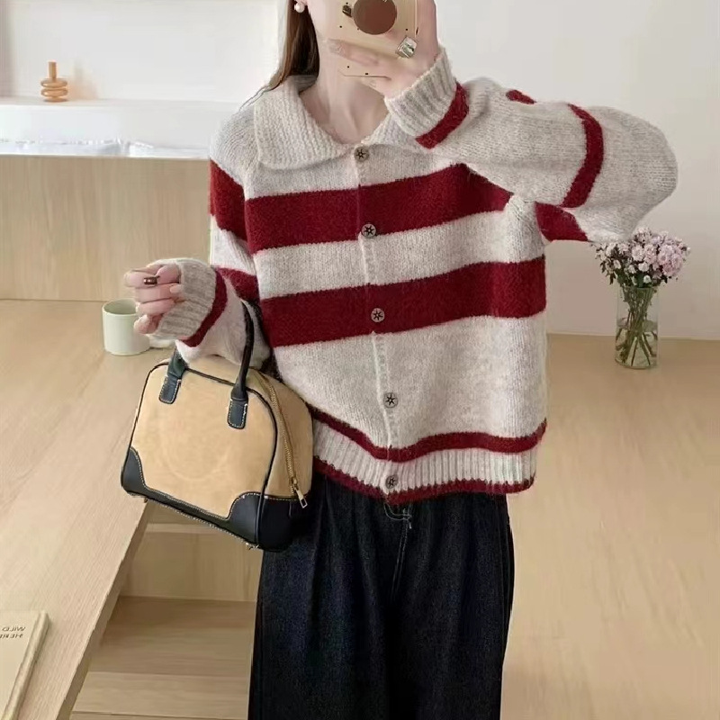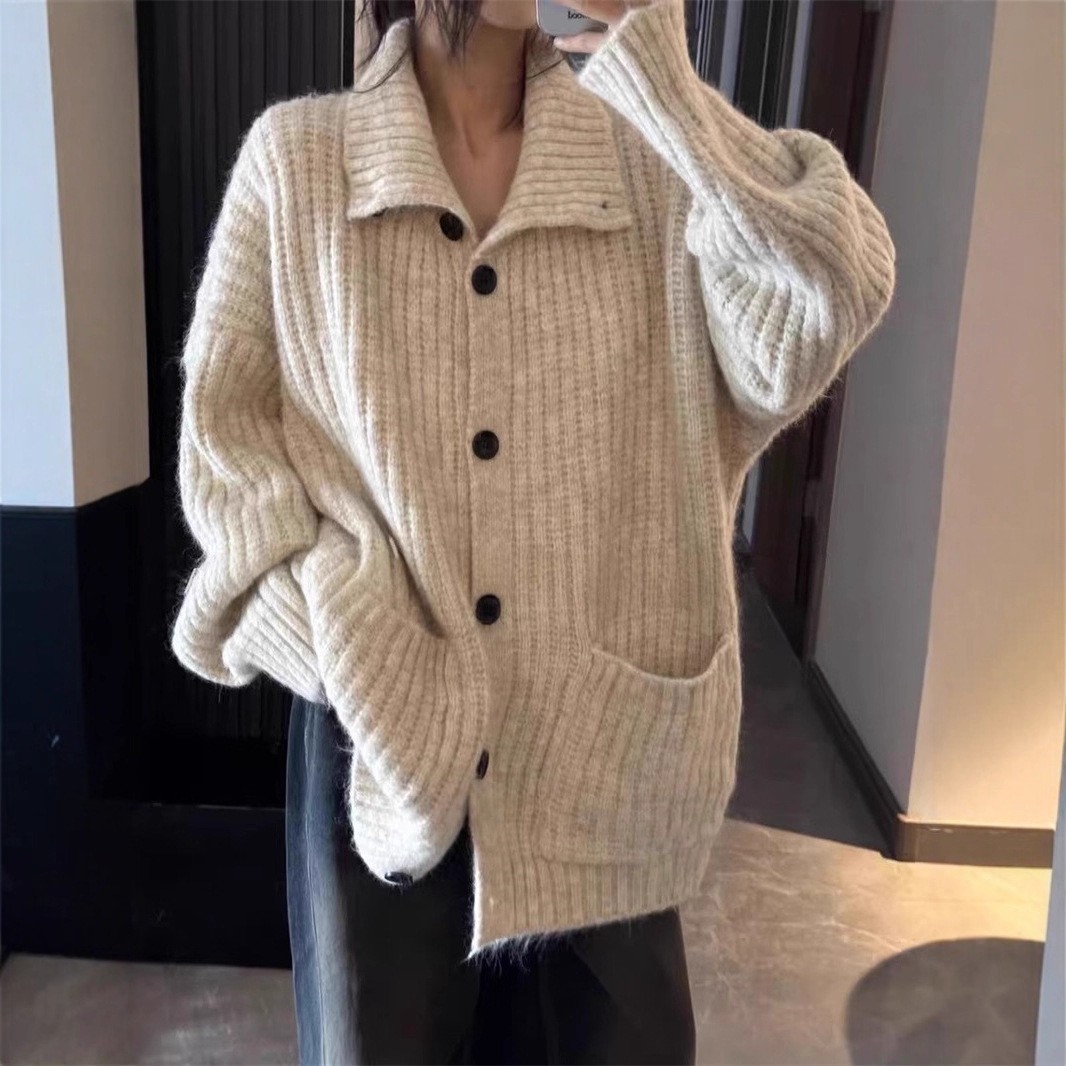 韩系穿搭慵懒翻领开衫毛衣女纽扣设计高级感宽松软糯针织上衣外套