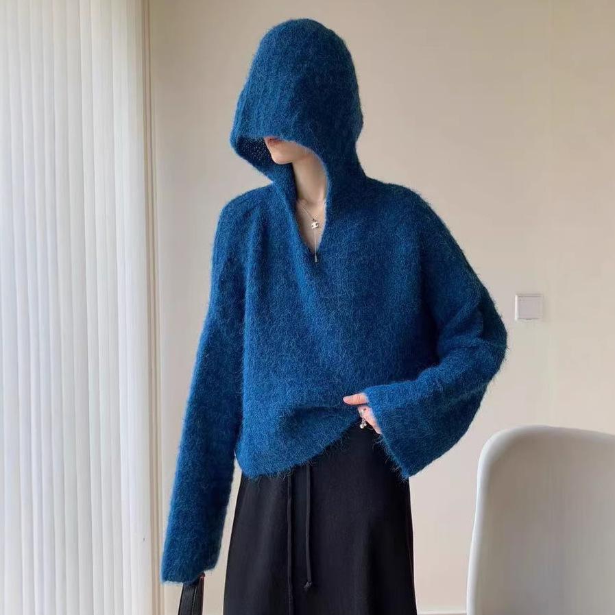 跨境现货慵懒休闲套头毛衣女2025韩版连帽半开领套头针织衫上衣