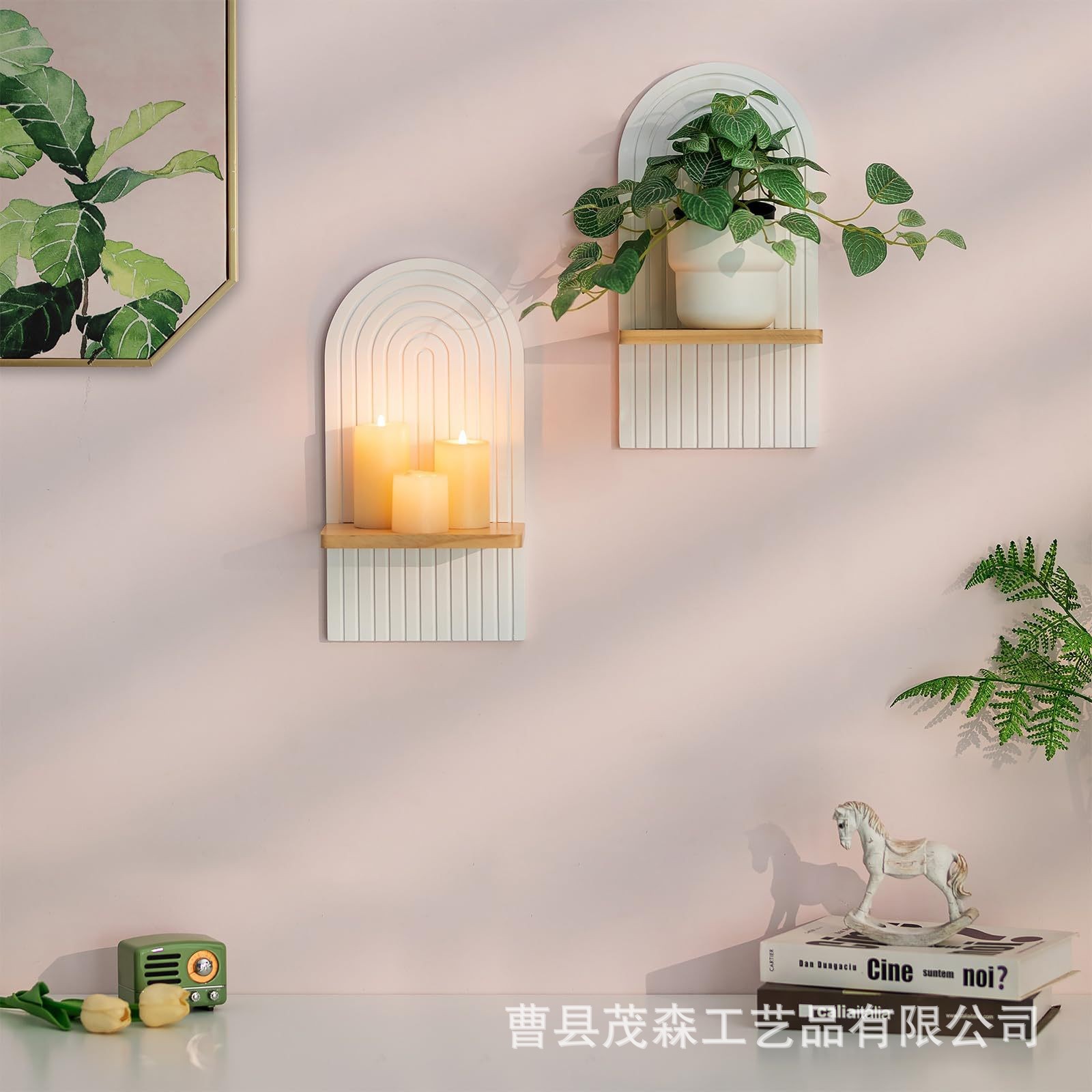 北欧風の壁の置物棚の白い燭台のアーチ型の装飾棚の壁掛け式の背景の壁の装飾のろうそくの展示棚