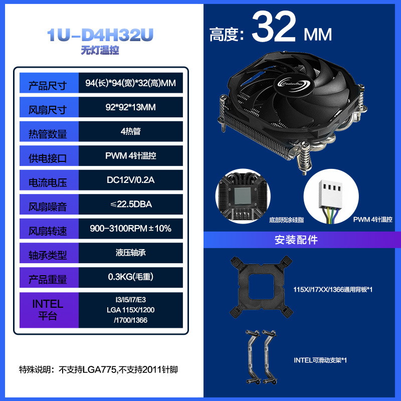 一体机NAS ITX 台式电脑CPU下压式 超薄1U纯铜热管静音散热器风扇