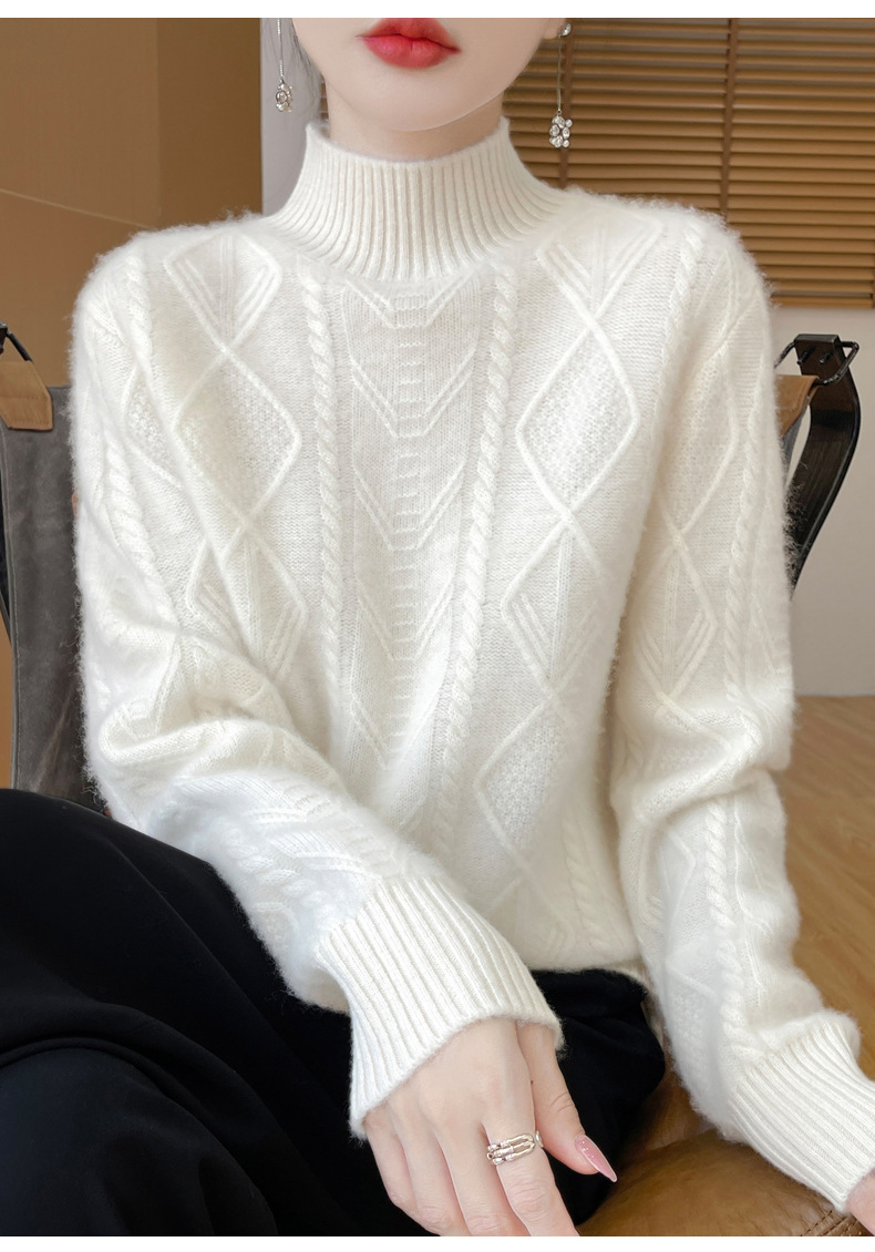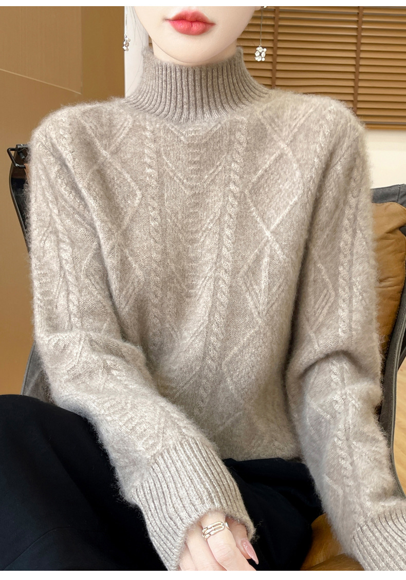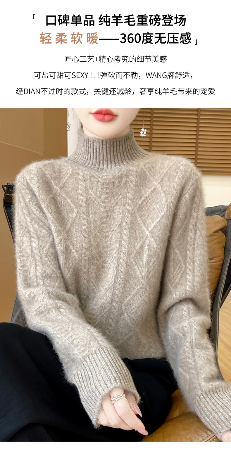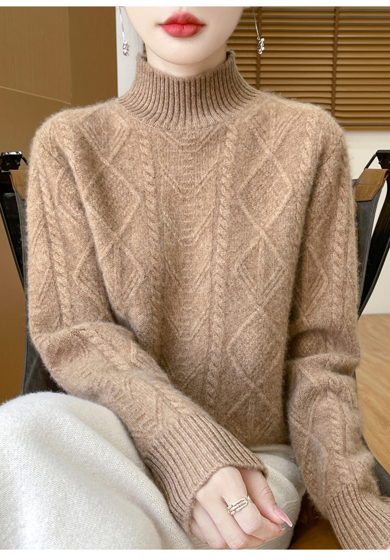 2024秋冬厚さ半高襟ツイスト100純ウールセーター女性のゆるい怠惰なカシミヤニットセーター