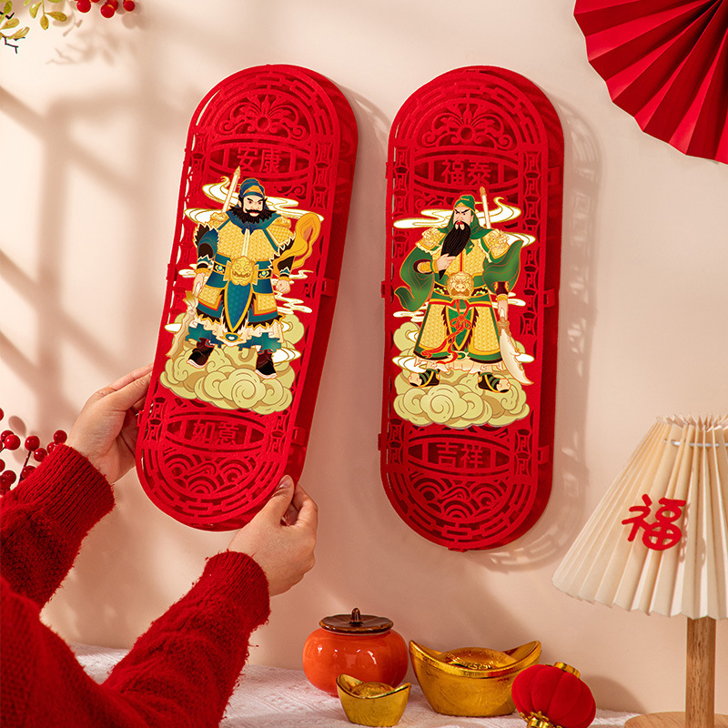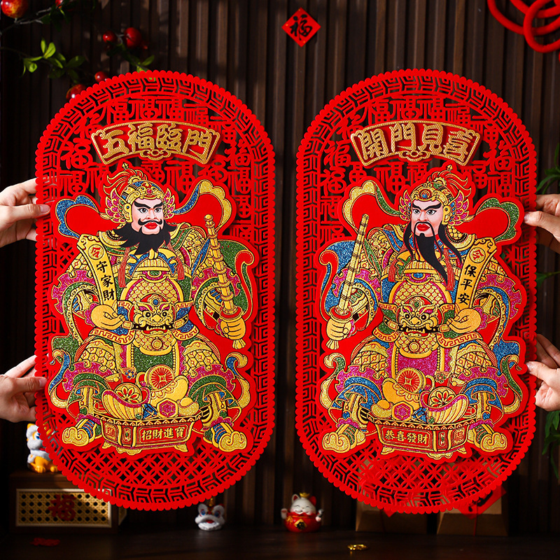 2026年馬年新作 国潮立体門神ステッカー 春節新年用 ベルベット製 透かし彫り 自己粘着式 門神 将軍 シングル/ダブルドア用