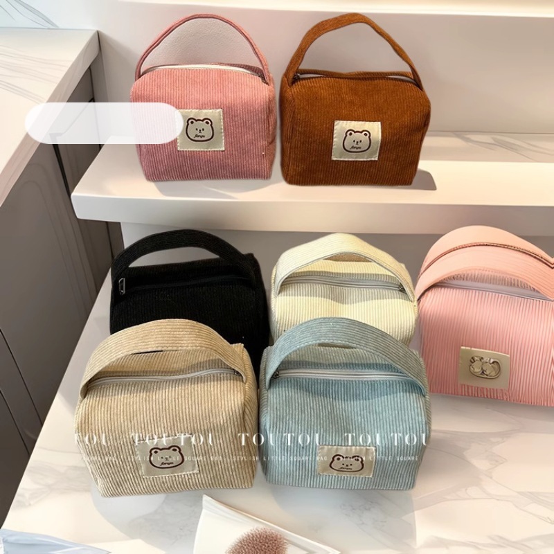 2025年秋新作コーデュロイ化粧ポーチ大容量収納バッグ可愛いクマ柄ハンドバッグレディースバッグ海外トレンドバッグ