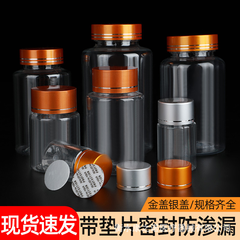 スポット卸売り50ml 100ミリリットル透明プラスチックボトルpetカプセルボトル液体固体分注ボトル金蓋銀蓋