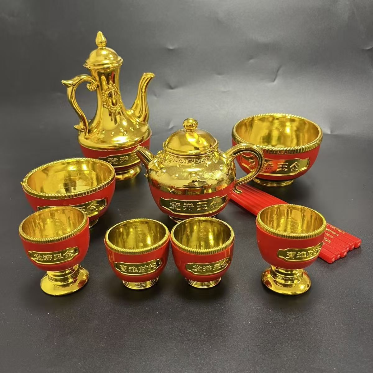 お供えは金色のプラスチックを祭って金のティーポットを招きます。