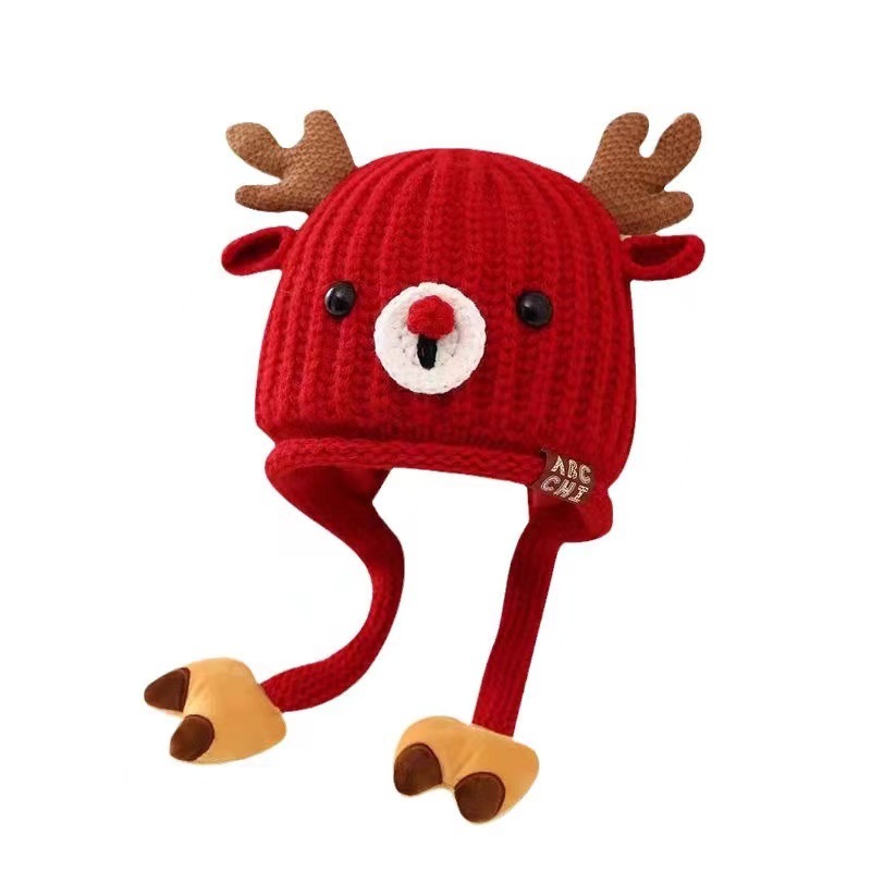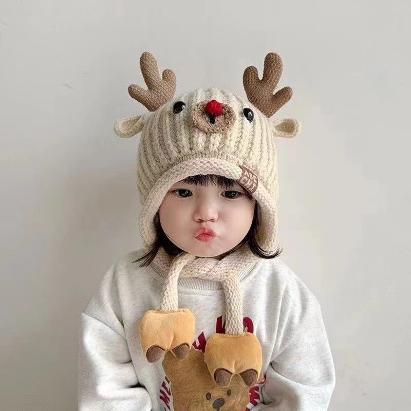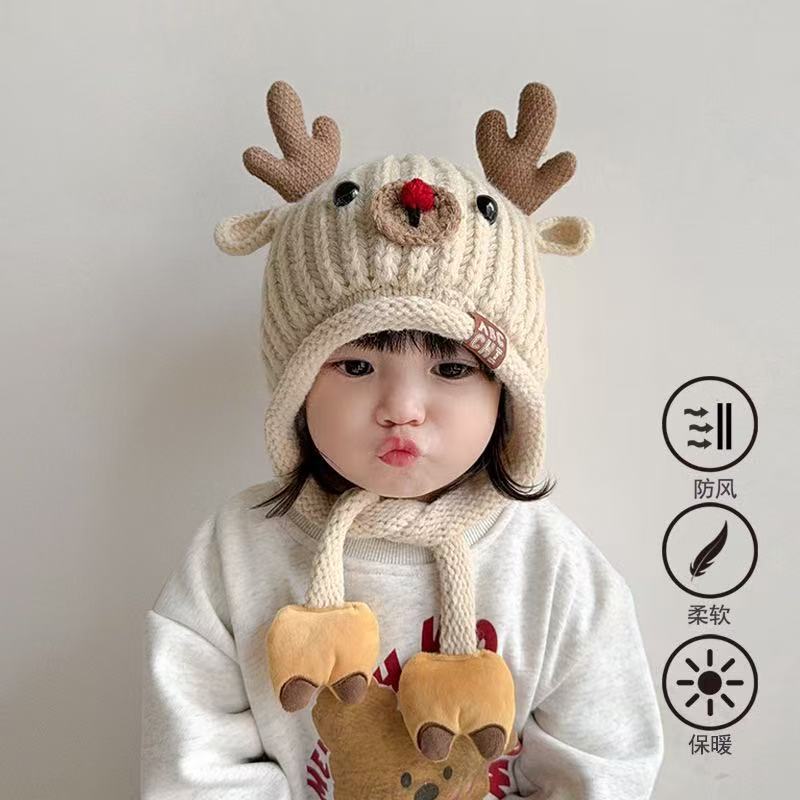 宝宝帽子冬季可爱小鹿加绒护耳帽男女童针织帽秋冬加厚保暖毛线帽