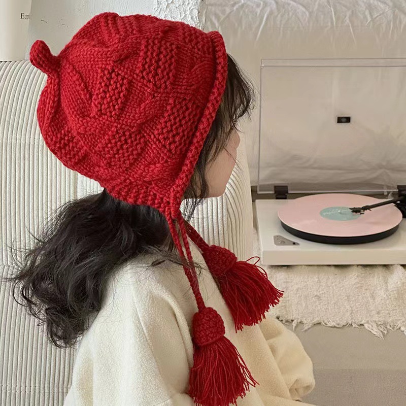 女の子の秋冬の厚手のフリンジの帽子の洋気の手作りのニット帽の新年の赤い帽子の保温の頭の帽子