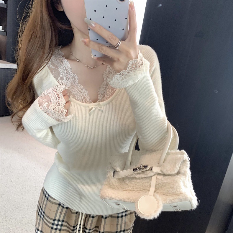 純粋なデザイン感の独特なレースのつなぎ合わせの底のシャツの女性の春秋の修身の百合の気質の長袖のニットの上着