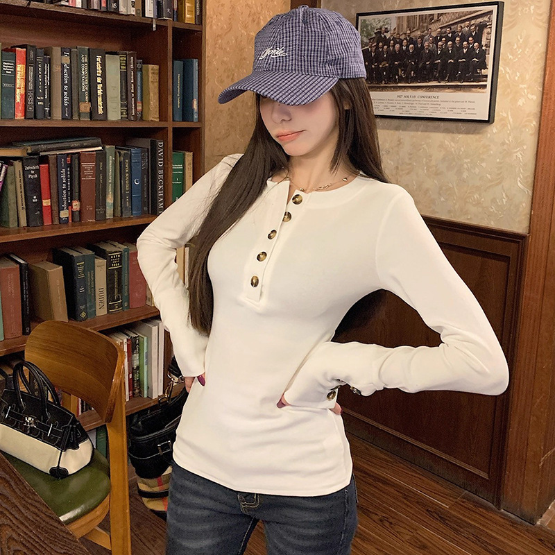 设计感袖口纽扣修身打底衫2025秋季新品开领长袖T恤女亨利衫加绒