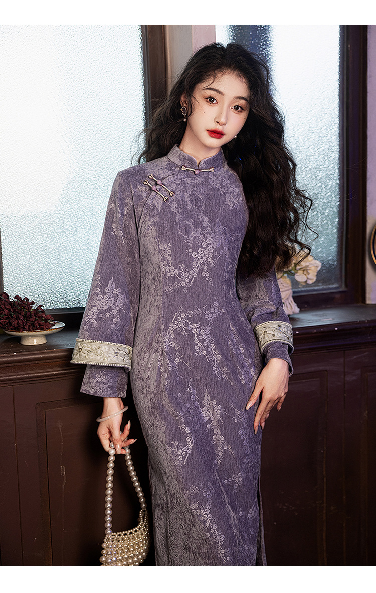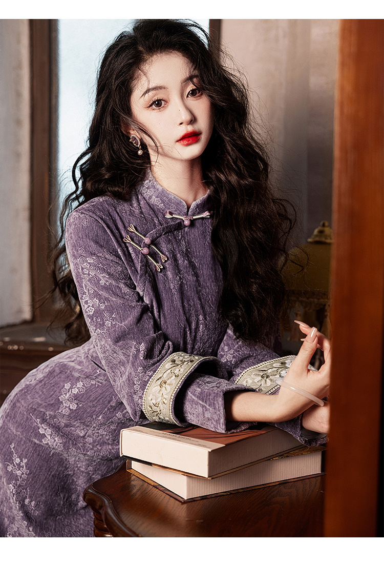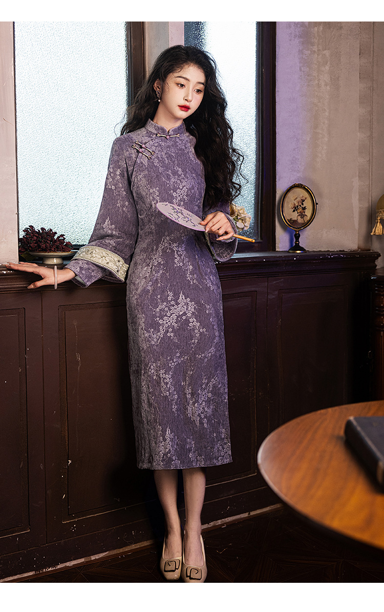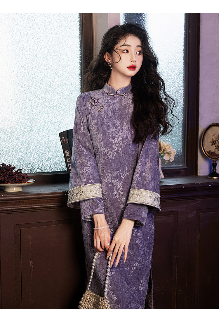 新中国風長袖民国時代淑女旗袍2025年新改良中国風少女レトロ紫秋冬