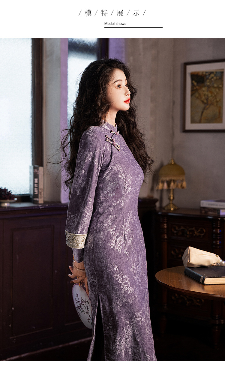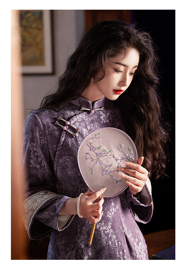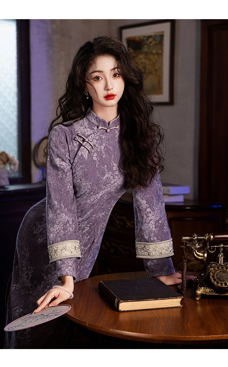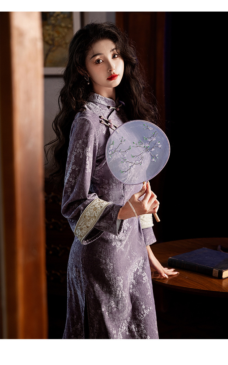 新中国風長袖民国時代淑女旗袍2025年新改良中国風少女レトロ紫秋冬
