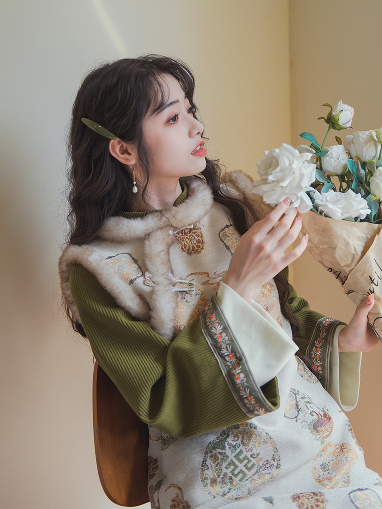 【云水瑶】麂皮绒新中式改良压花旗袍满幅刺绣缎面国风马甲两件套