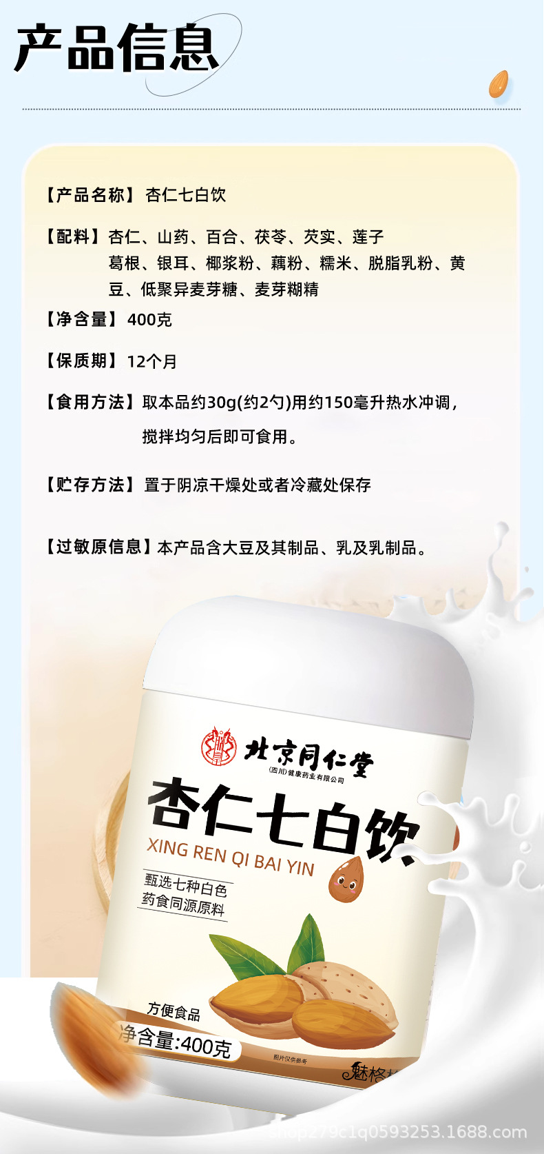 北京同仁堂アーモンド七白飲代食栄養朝食抽出インスタント飲料アーモンド粉公式純正品