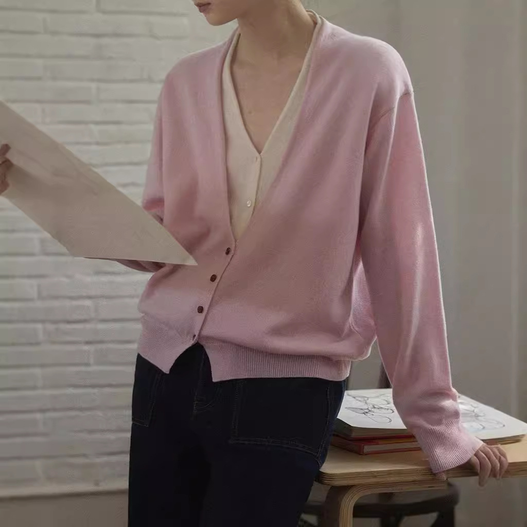 知識人風は衝突色のvネックの偽の2つのニットのカーディガンの女性の灰色のピンクの秋の新型を着ます。