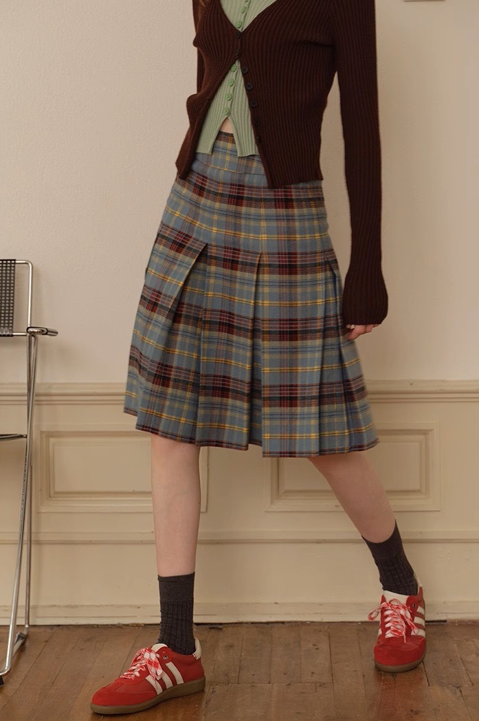 首尔高校生Luca格纹复古高腰a字裙灰色长裙秋冬压褶长款半身裙女