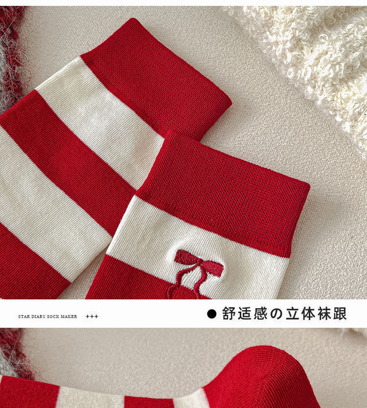 ダブルニードル赤い靴下レディースミドルストッキング秋冬ins潮刺繍愛ハートアルファベットストライプレディース綿ソックスストッキング