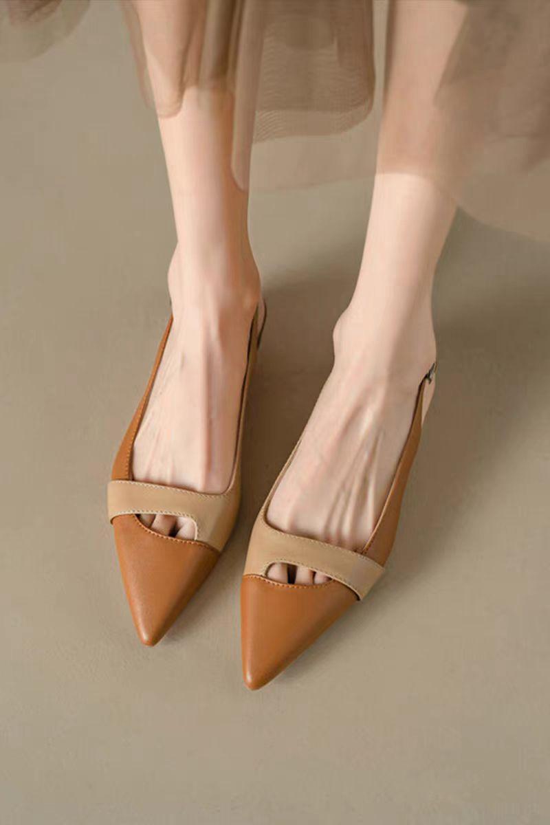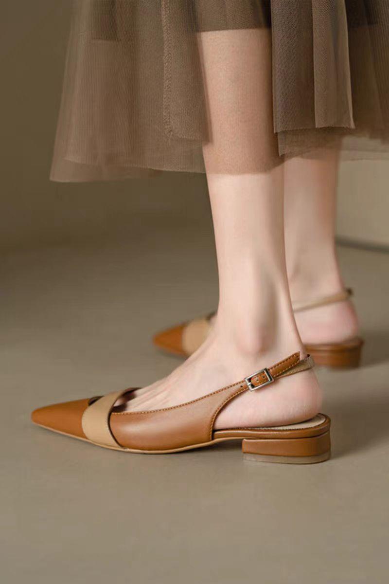包頭フレンチスタイルシューズ、レトロなカラーブロックのポインテッドトゥフラットシューズ、スカート付きの夏の女性用ファッションサンダル