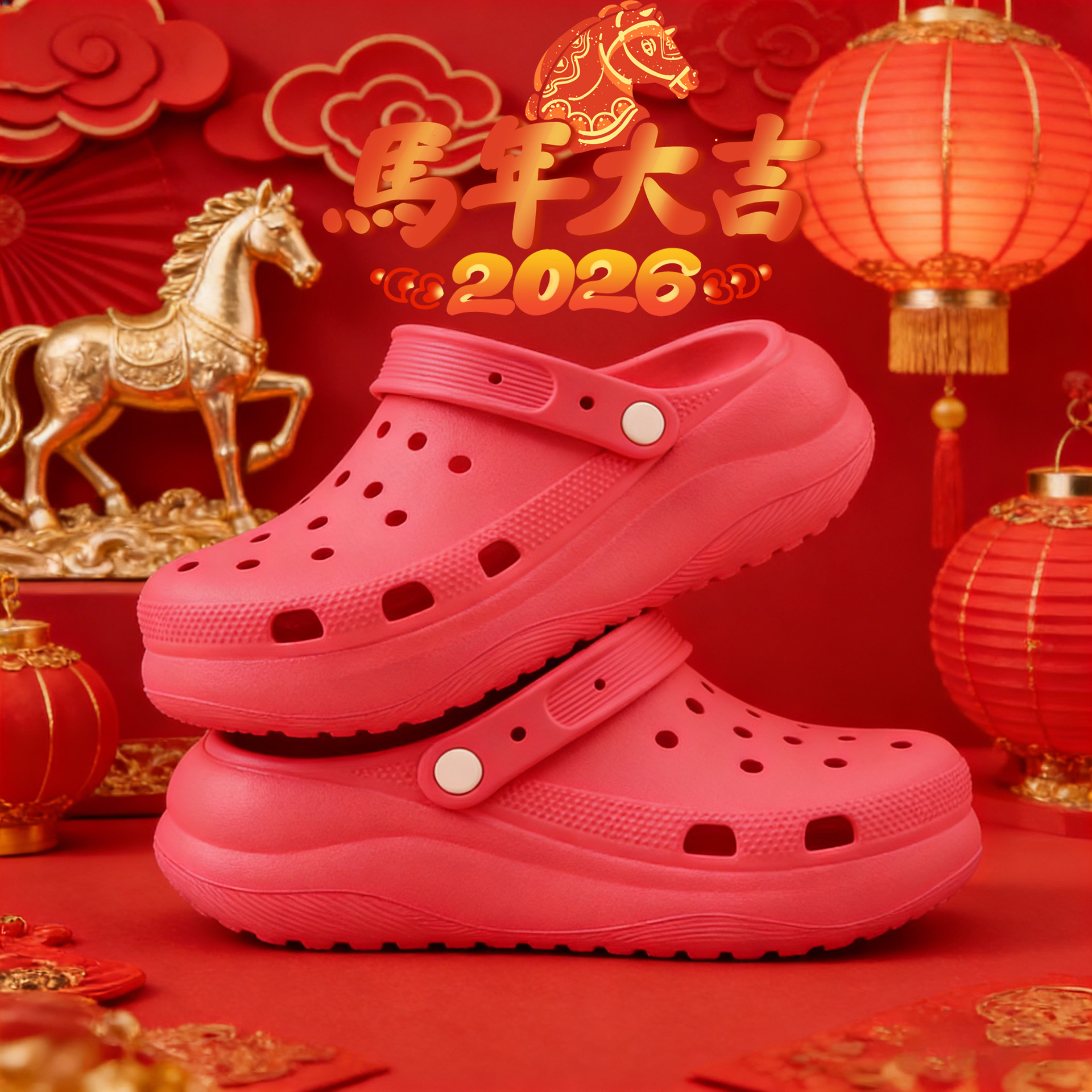 本命年洞洞鞋厚底女士红色喜庆凉鞋透气5cm增高EVA外穿沙滩凉拖鞋