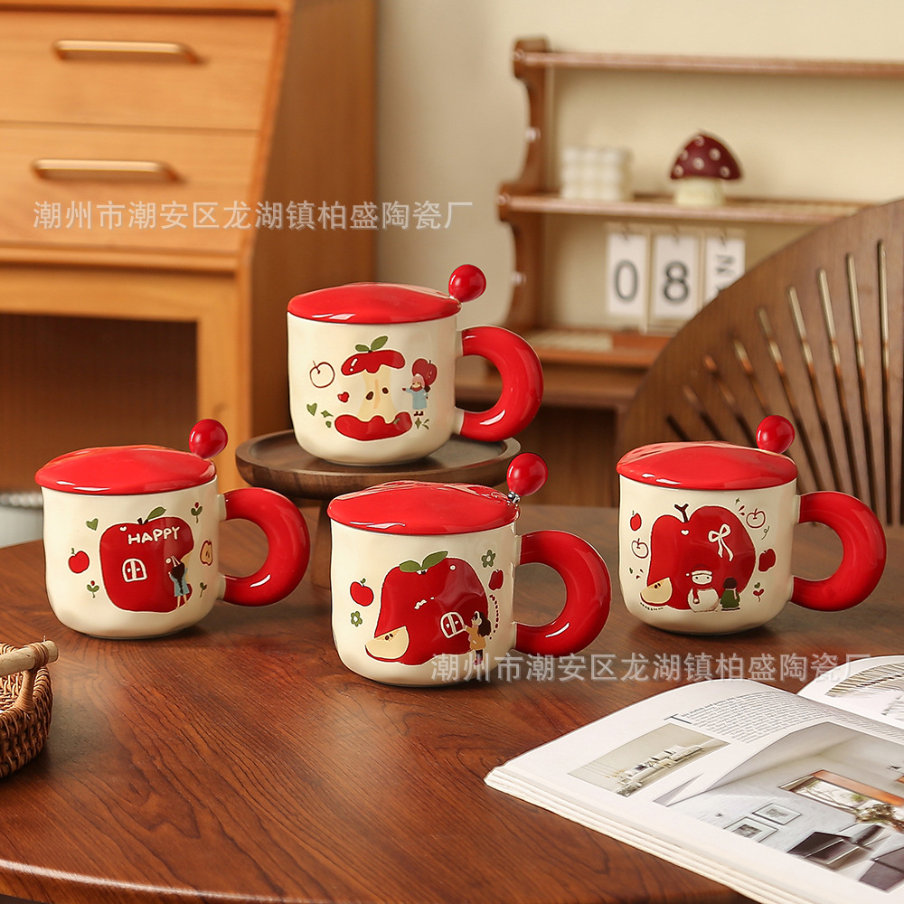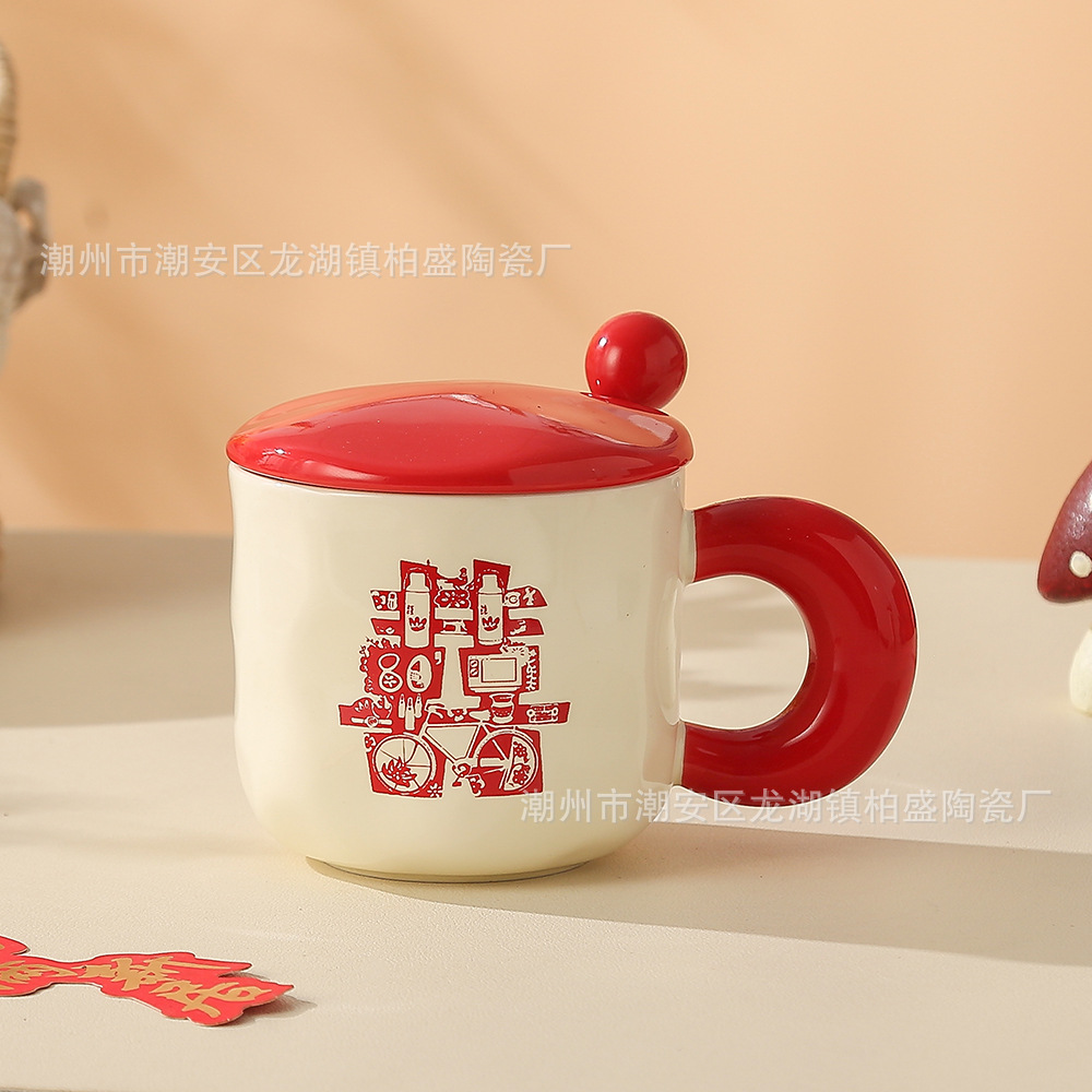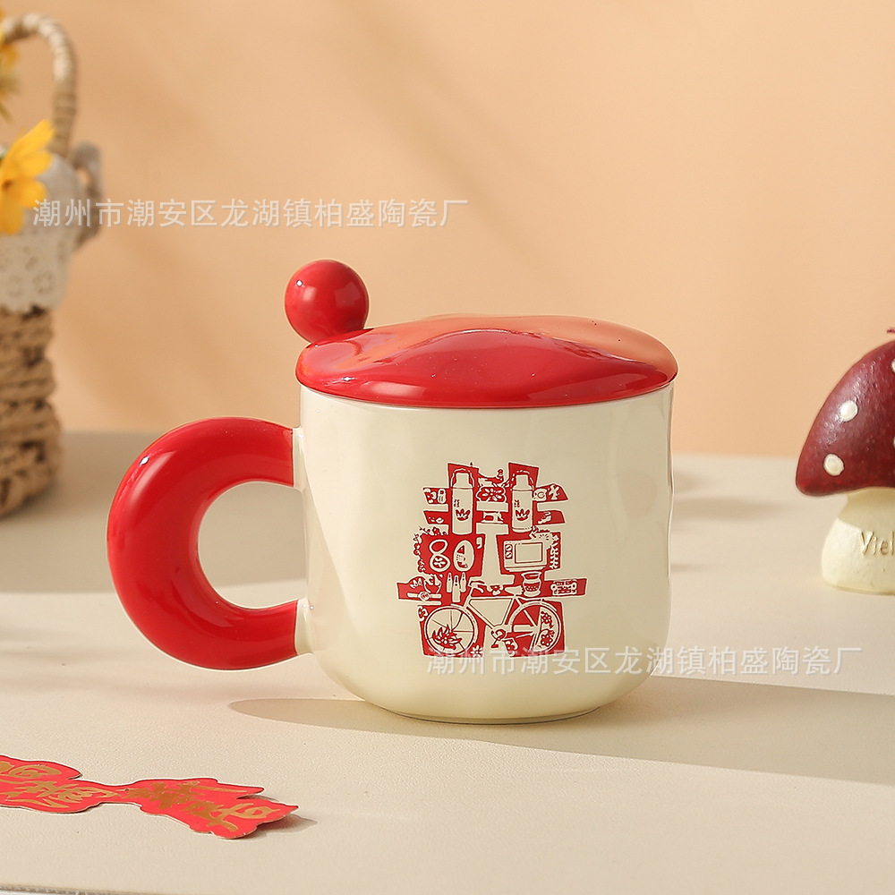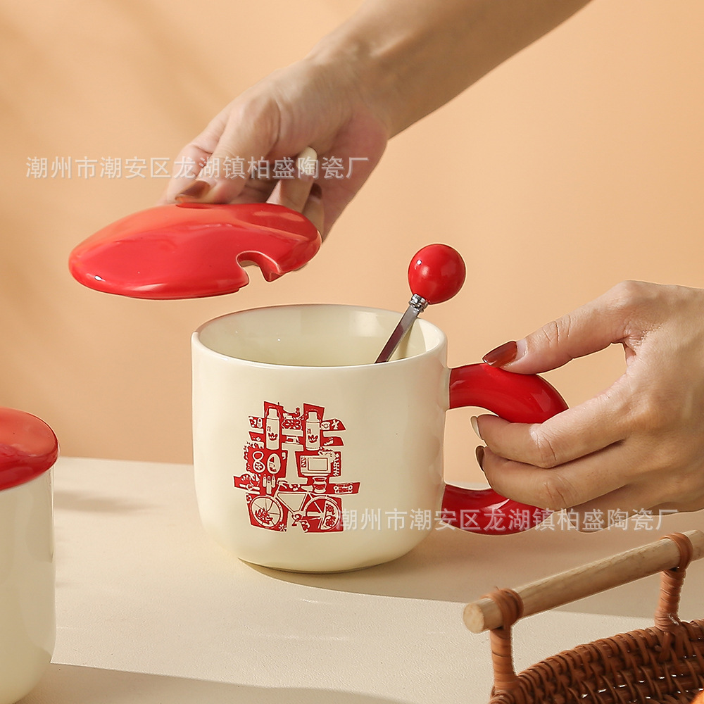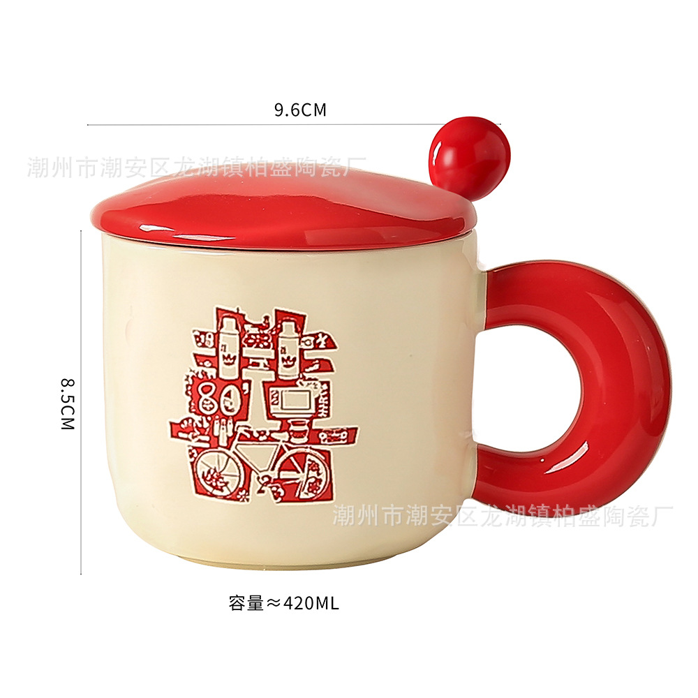 蓋とスプーン付きのレトロなマグカップ、セラミックカップ、女性用カップ、新年の贈り物、コーヒーカップ、カップル用ミルク朝食カップ