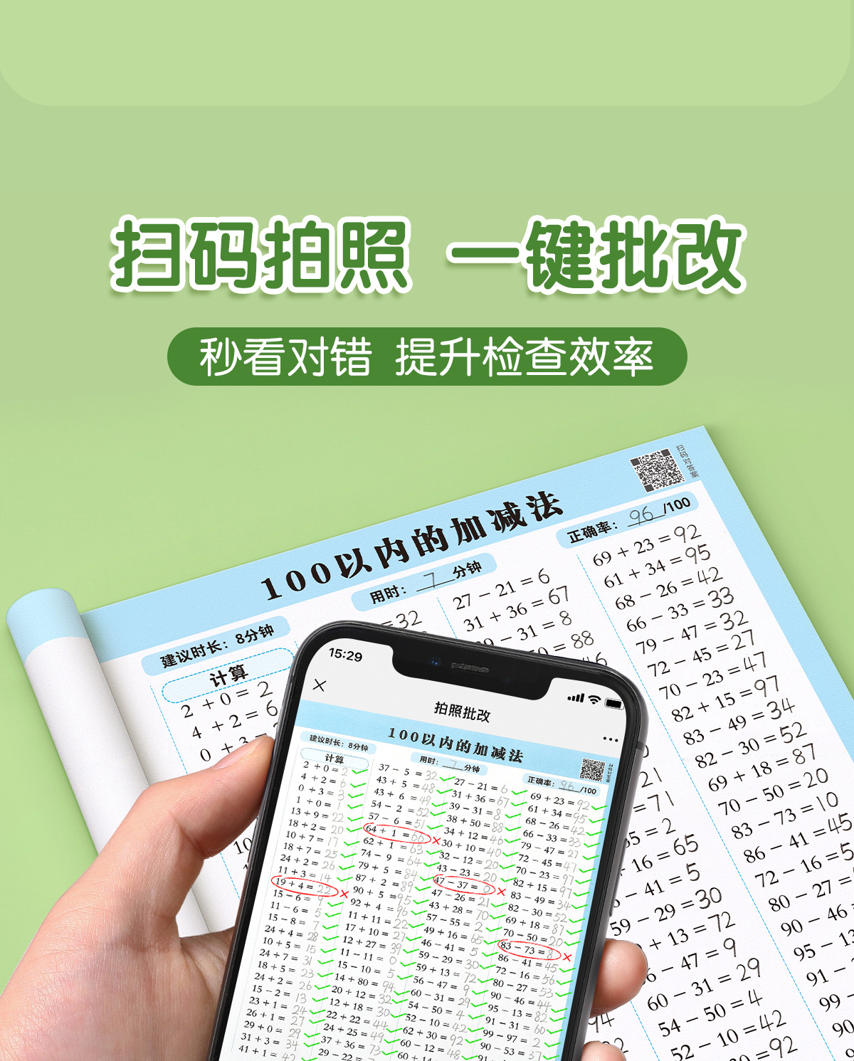 数学速算練習紙口算問題カード102050100以内加減算横式縦式練習紙一二