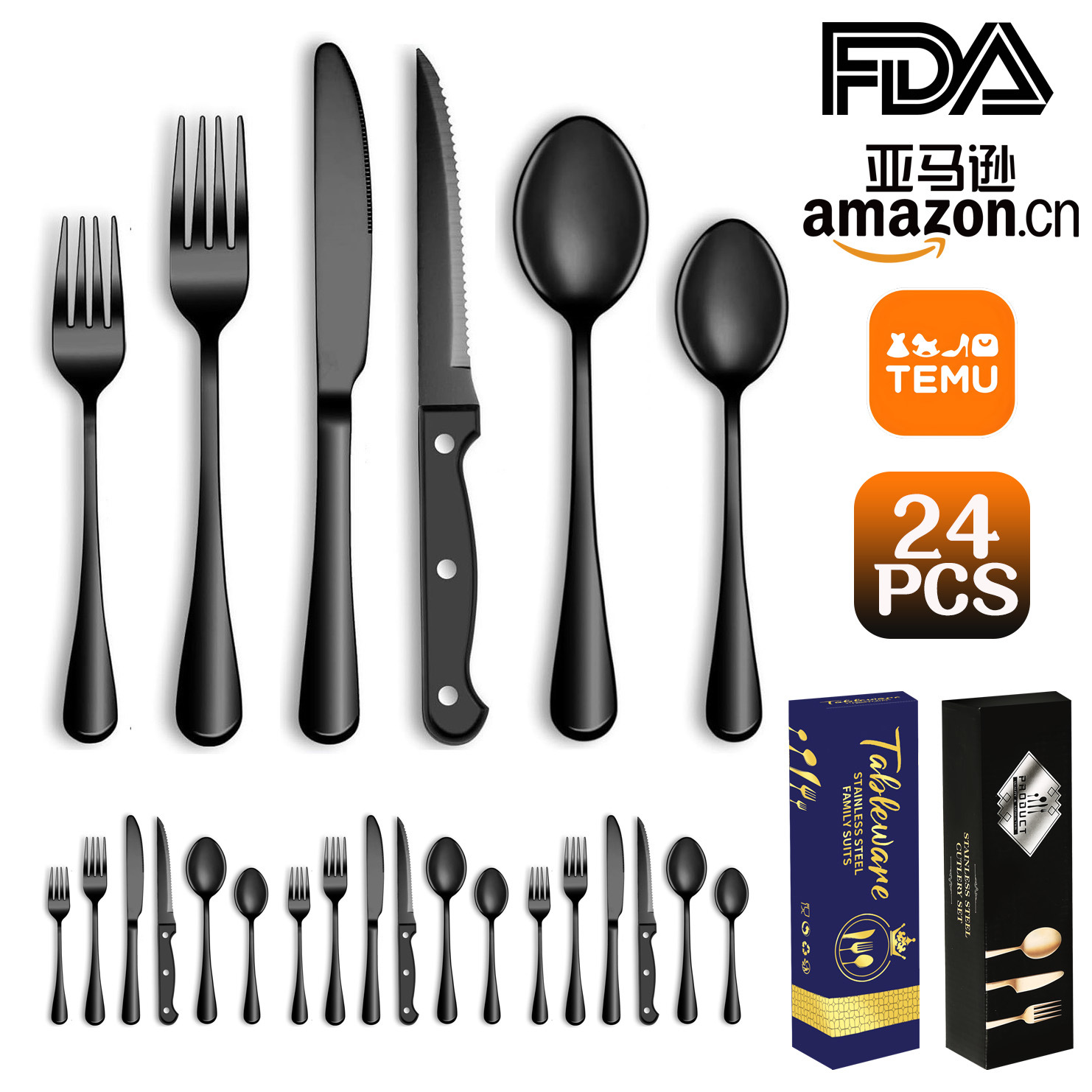 亚马逊不锈钢西餐具1010刀叉勺 6件套主餐刀牛排刀黑色餐具套装