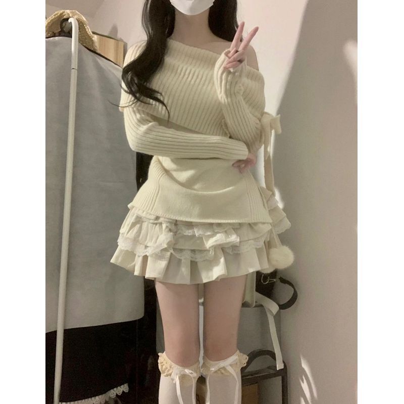 两件套装2025春秋季新款学院风设计感小众一字肩针织毛衣+半身裙