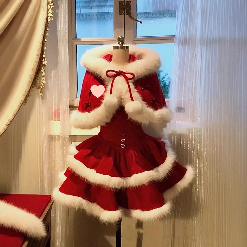 公主两件套圣诞蓬蓬裙法式千金连衣裙冬装红丝绒蛋糕氛围套装感