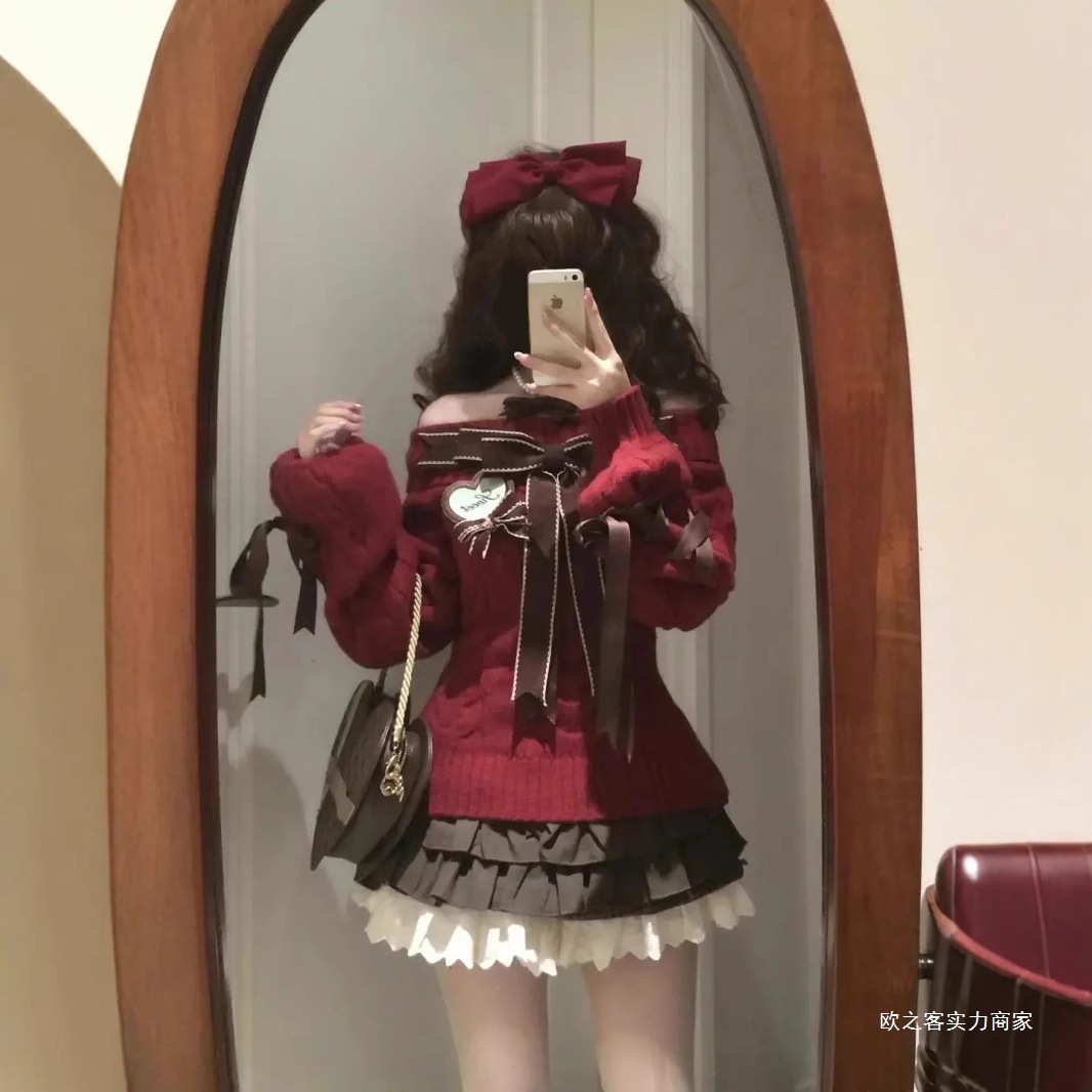 優しい肩の学院風ニットセーターかわいい女性の甘い妹の蝶結びの上着の半身のスカートの2つのセット