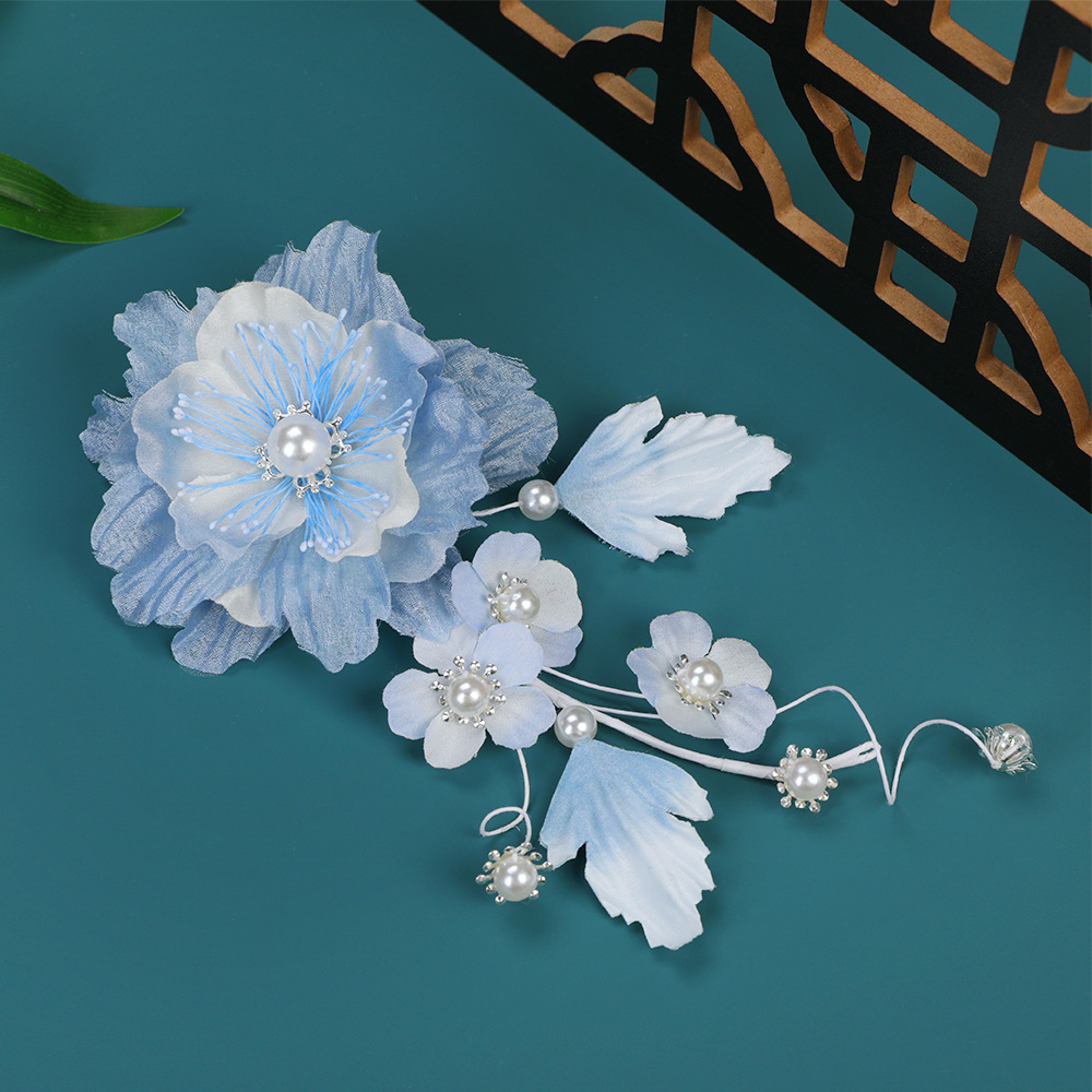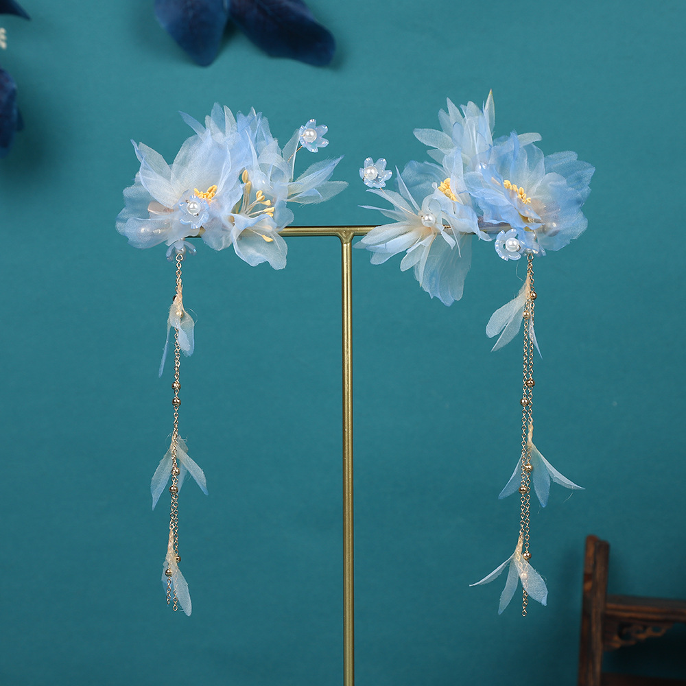新しい手作りの青いガーゼの花のフリンジの対のヘアピンの時代の服の仙気の髪形は古風の髪飾りの漢服の頭飾りを飾ります。