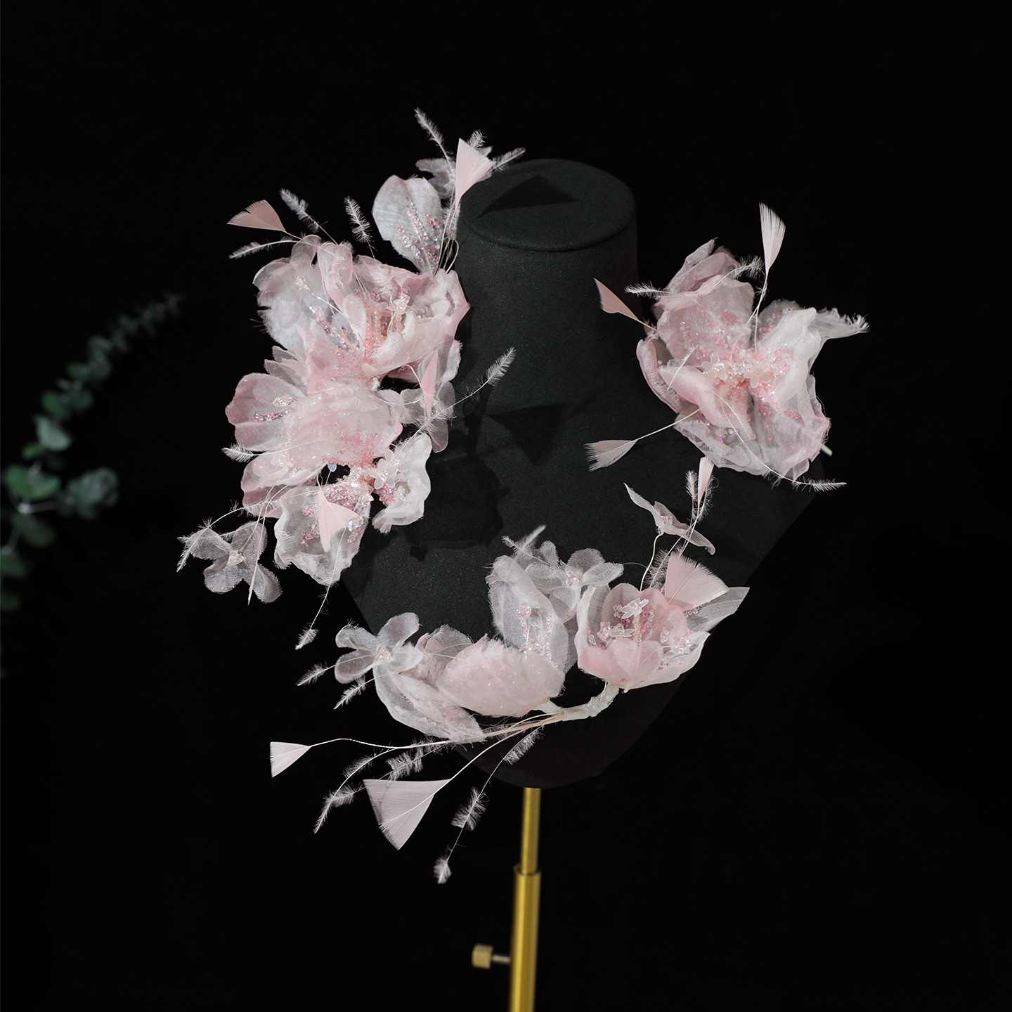 赫拉原创纯手工高级感粉色羽毛花朵发夹婚纱晨袍减龄盘发新娘头饰