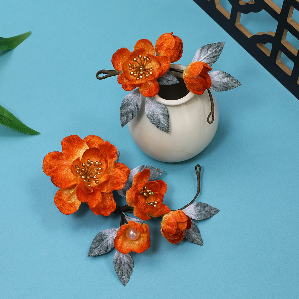 オリジナルデザイン、手作り、アンティークスタイル、グラデーションオレンジ模造ベルベットフラワークラフト、ソフトヘアピン、メイクアップアクセサリー、漢服頭飾り