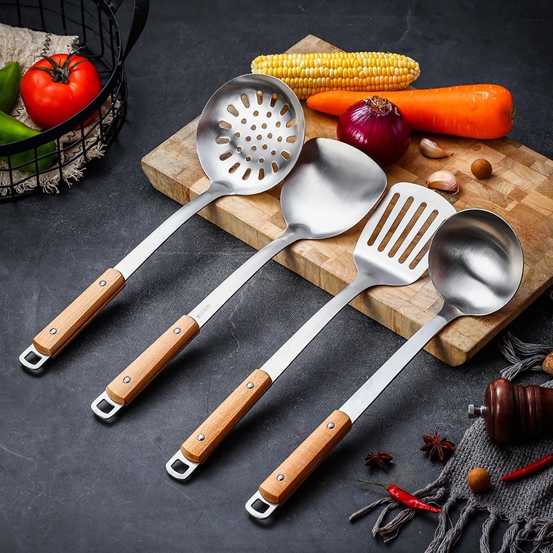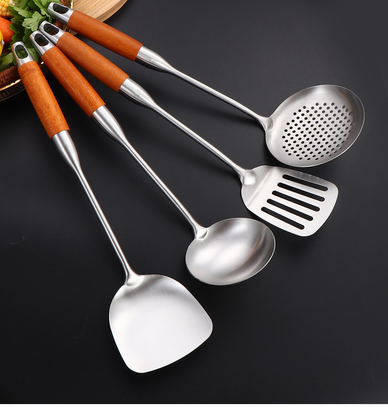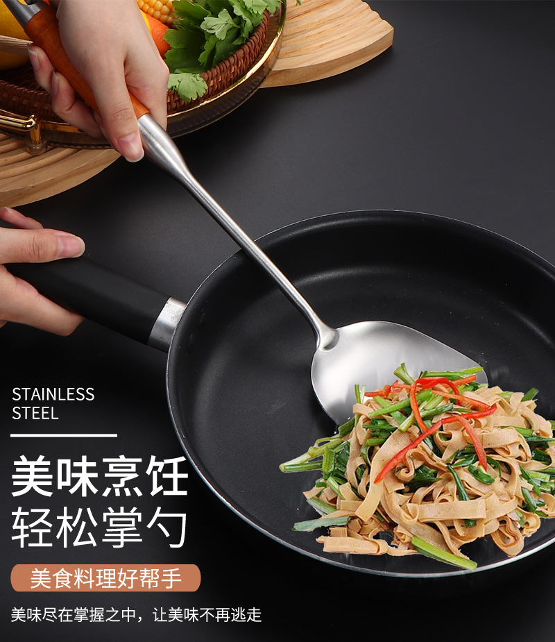 不锈钢锅铲厨具木柄炒菜铲子厨房汤勺漏勺烹饪漏铲防滑耐高温花梨