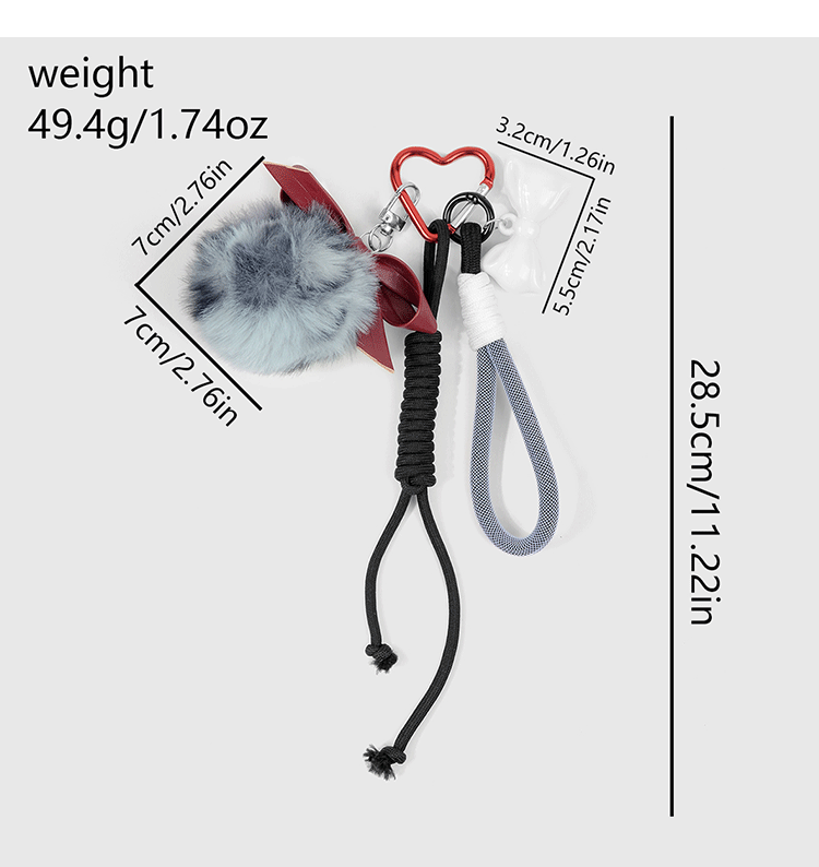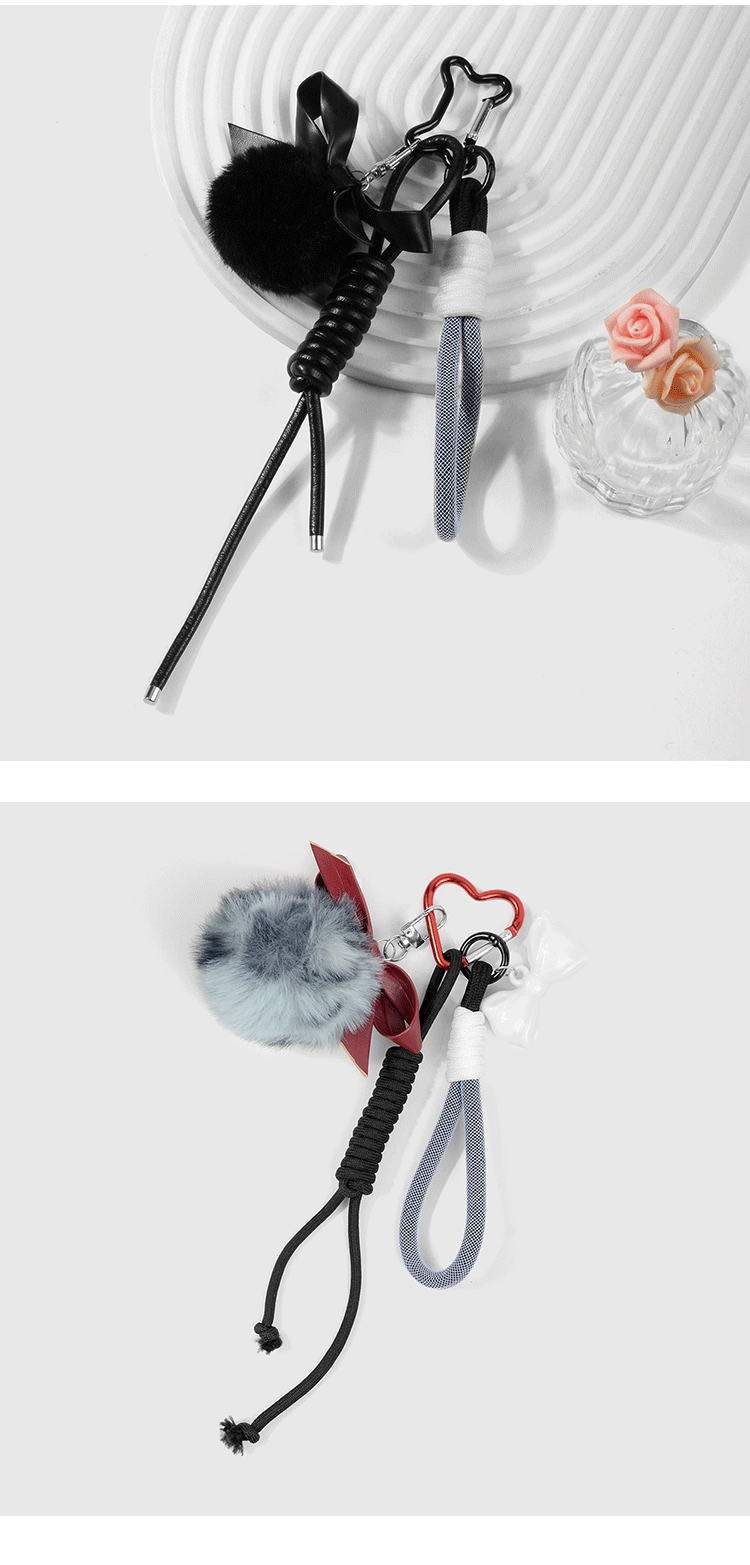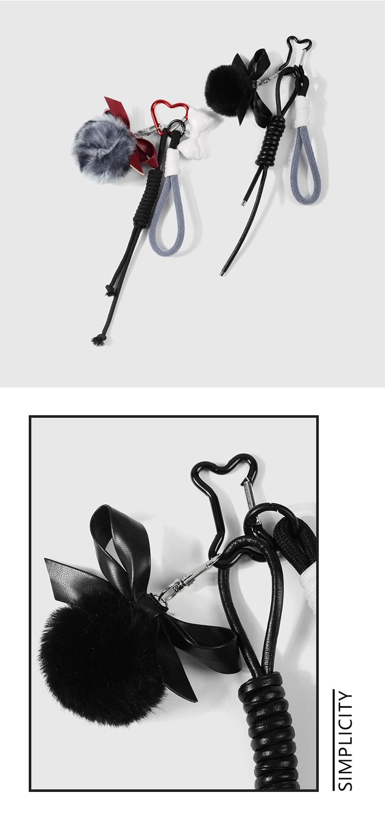 ブラックファーボールリボンスリングキーホルダー1個,グレーのヒョウ柄ファーボールリボンキーホルダー 1 個