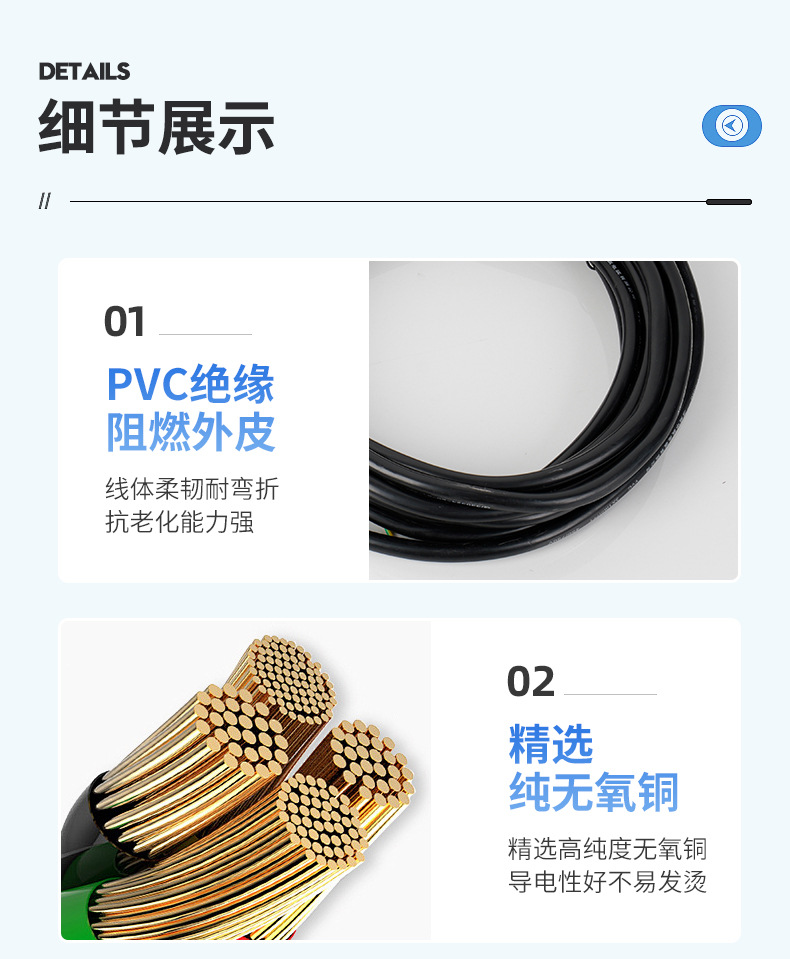 仕様とモデル 3*1mm2+1は1.5-2.2に適しています,3*1.5mm2+1は3-4KWに適しています,3*2.5mm2+1は5.5-7.5KWに適しています