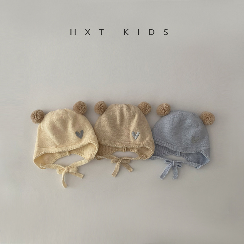 婴儿毛线帽秋冬季洋气爱心刺绣系带护耳帽小月龄宝宝双球针织帽冬
