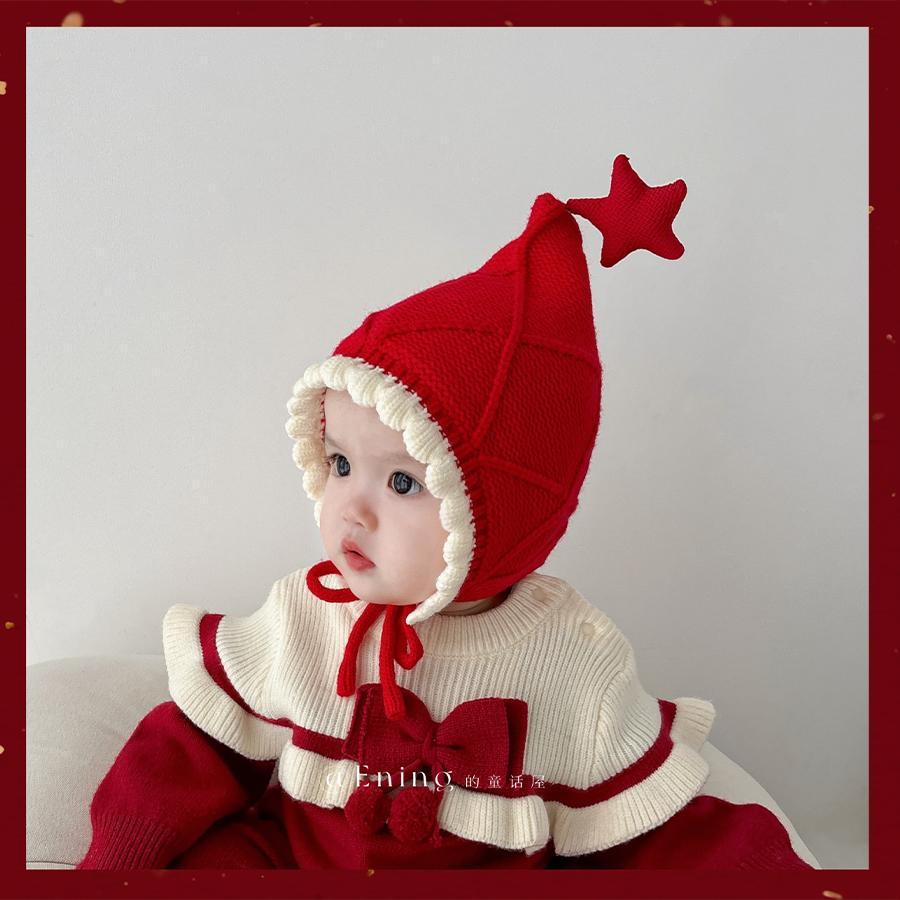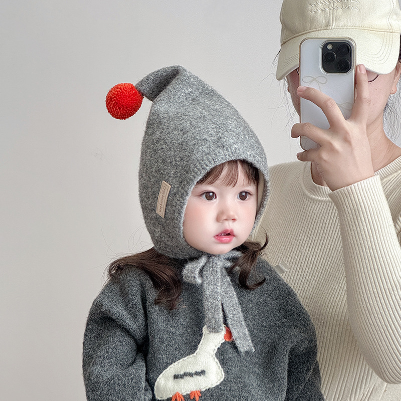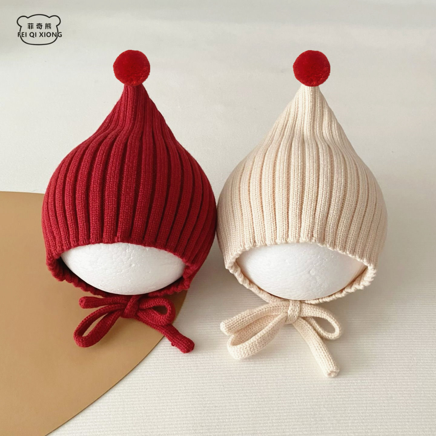 婴儿护耳帽秋冬季针织可爱球球尖尖小红帽防风保暖毛线宝宝精灵帽