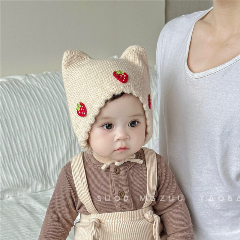 ベビー帽子秋冬女赤ちゃんいちご宮廷帽子二重裏防風保温毛糸耳保護帽
